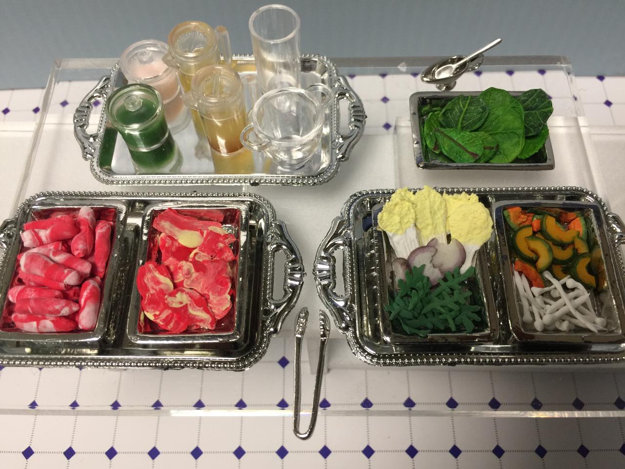 샤브샤브와 스키야키용 재료가 보이네요. 테이블로 가져가 즉석에서 요리를 해먹을 수 있습니다. (고기는 칼라클레이로, 호박은 모데나점토로 만들었습니다.)