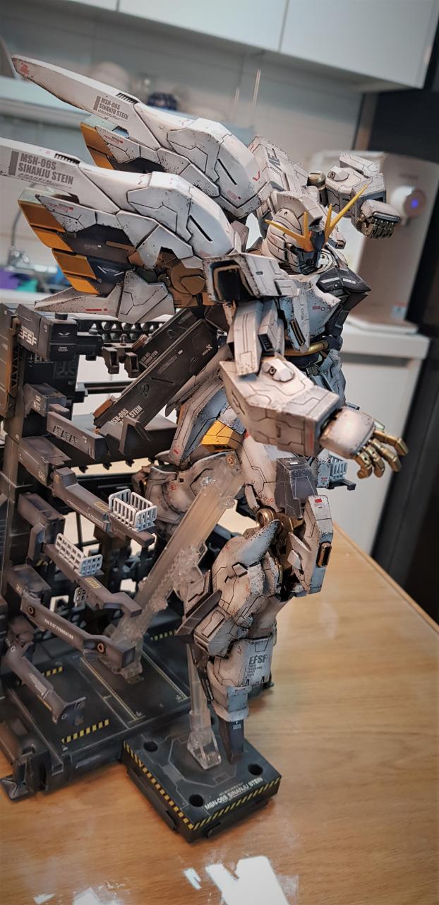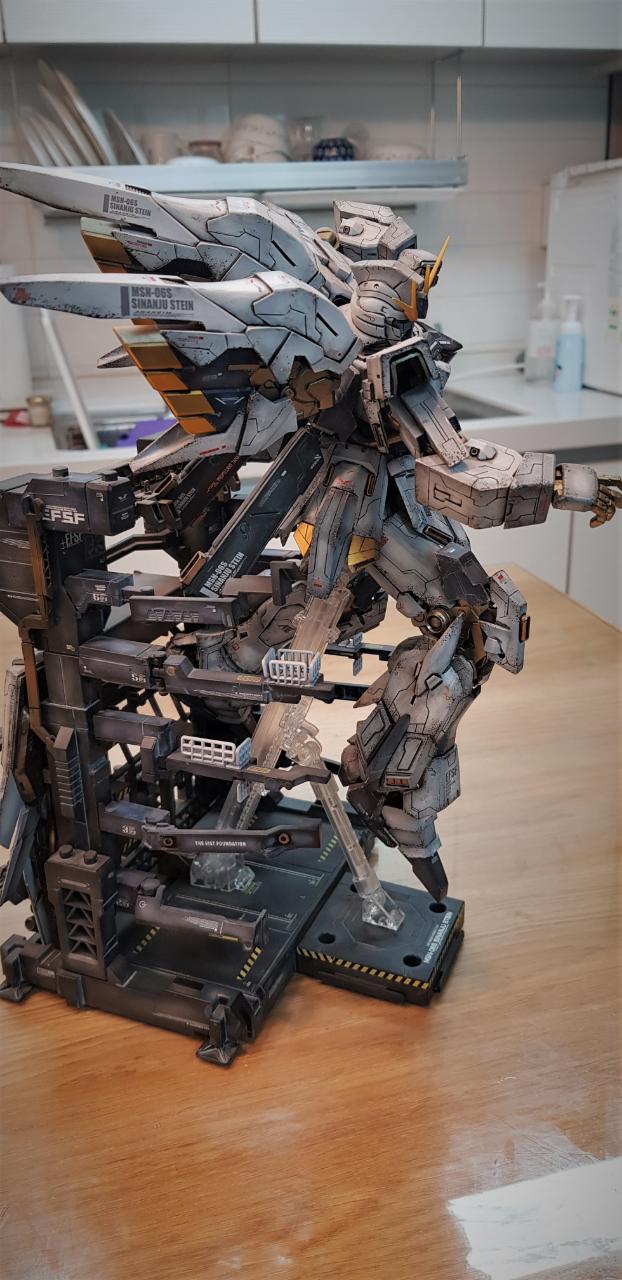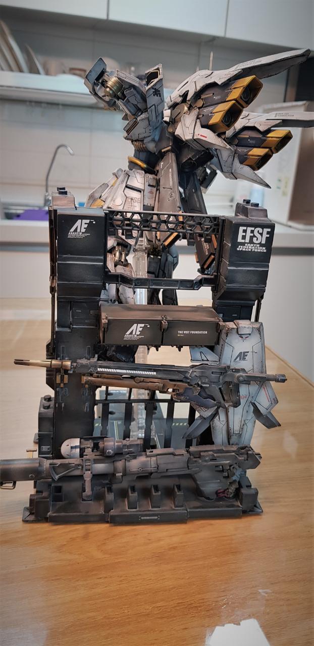 베이스로 사용한 행거는 원래 유니콘 건담용으로 나온 정품이 있지만, 예전에 가격이 훨씬 저렴한(대신 조립성이 최악인ㅠ)중국제를 구입해 놓은 것이 있어 재고처리차원에서 사용했습니다. 포즈상 무장이 필요없지만 만들어 놓은 것이 아까워 행거뒤에 순간접착제로 붙여버렸습니다.