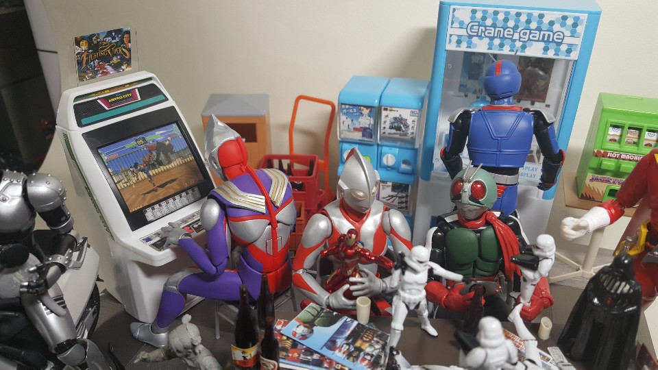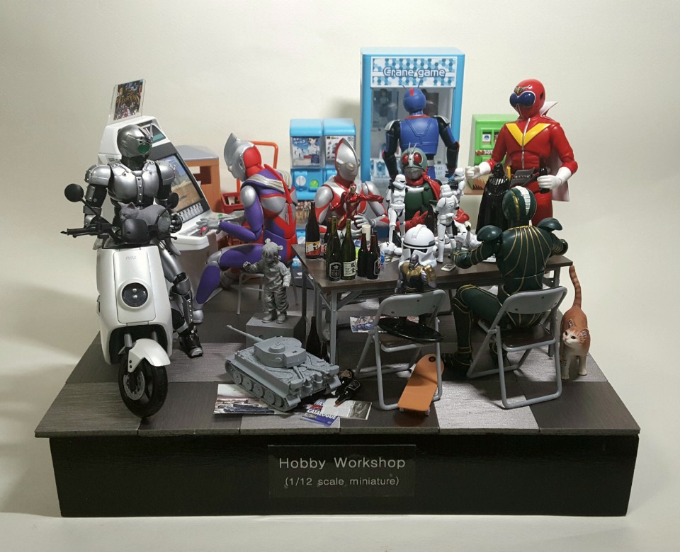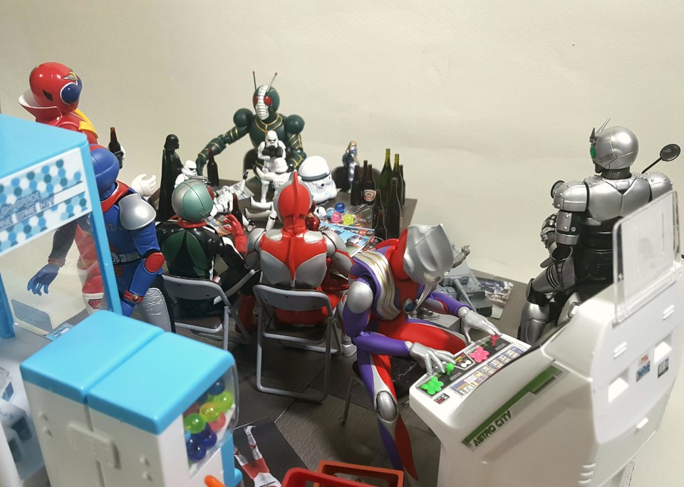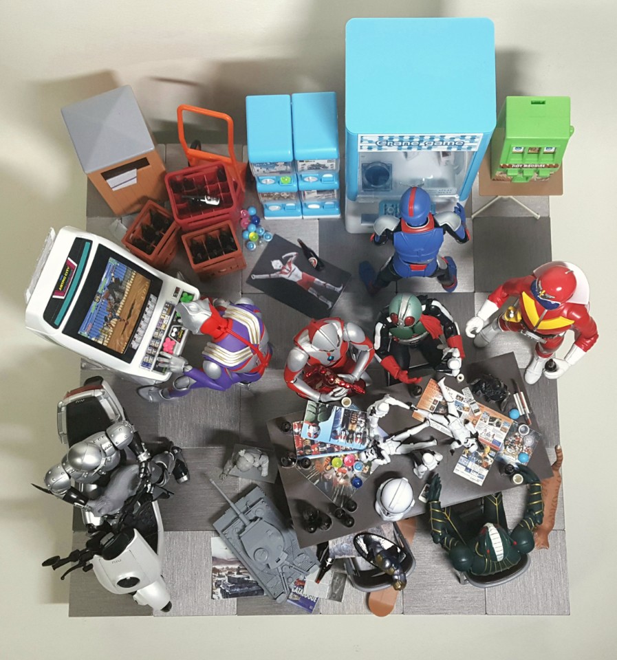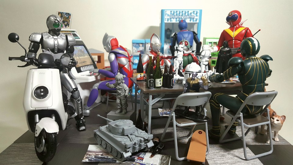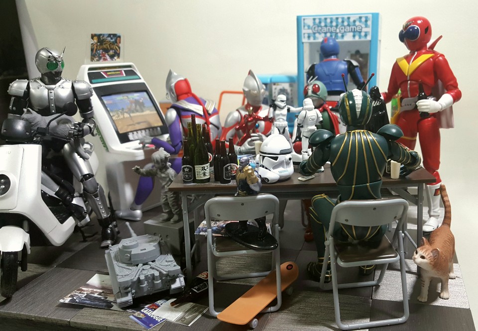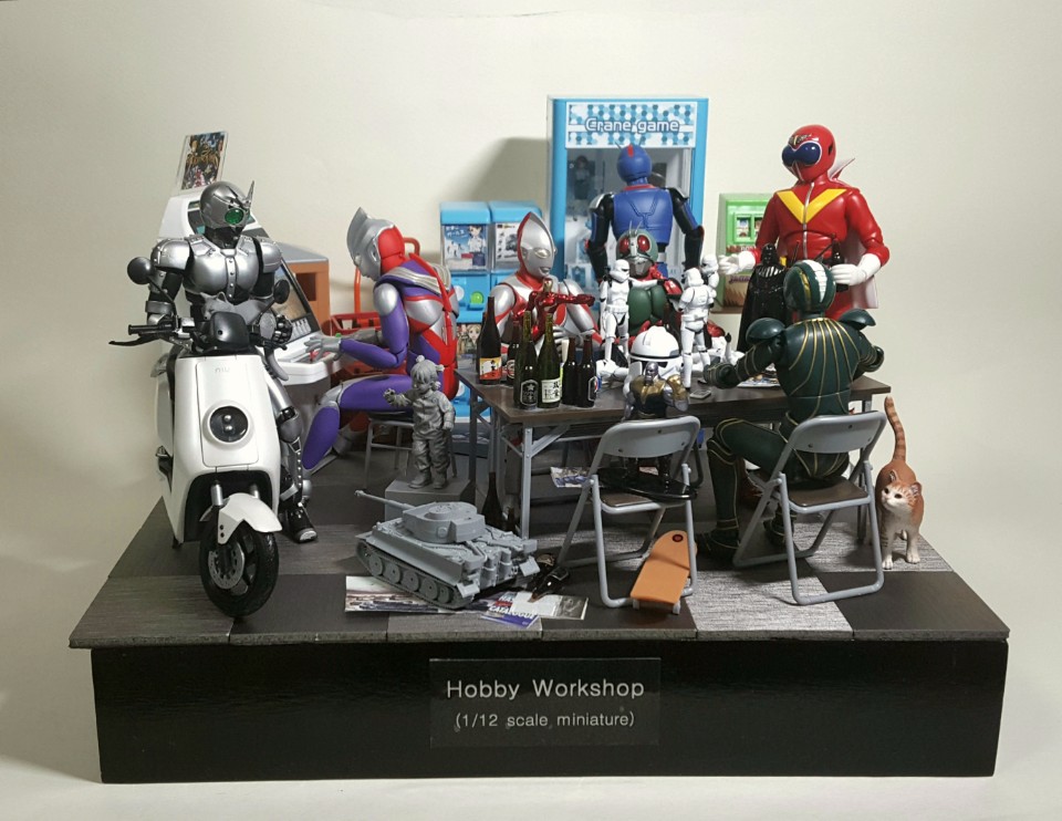 스토리는 공방 회원들이 각자 울트라맨/가면라이더 등 복장을 하고, 인형뽑기, 오락, 스타워즈/마블 피규어에 대하여 의견을 나누는 장면입니다. 그 와중에 다 큰 성인들이라 술병이 많이 나뒹굴고 있네요.ㅋㅋ