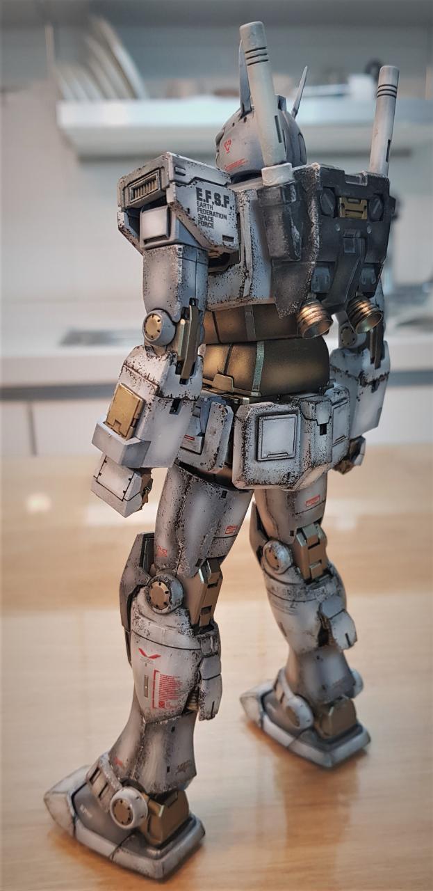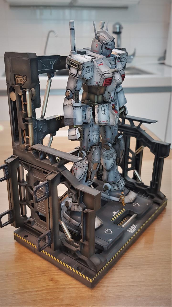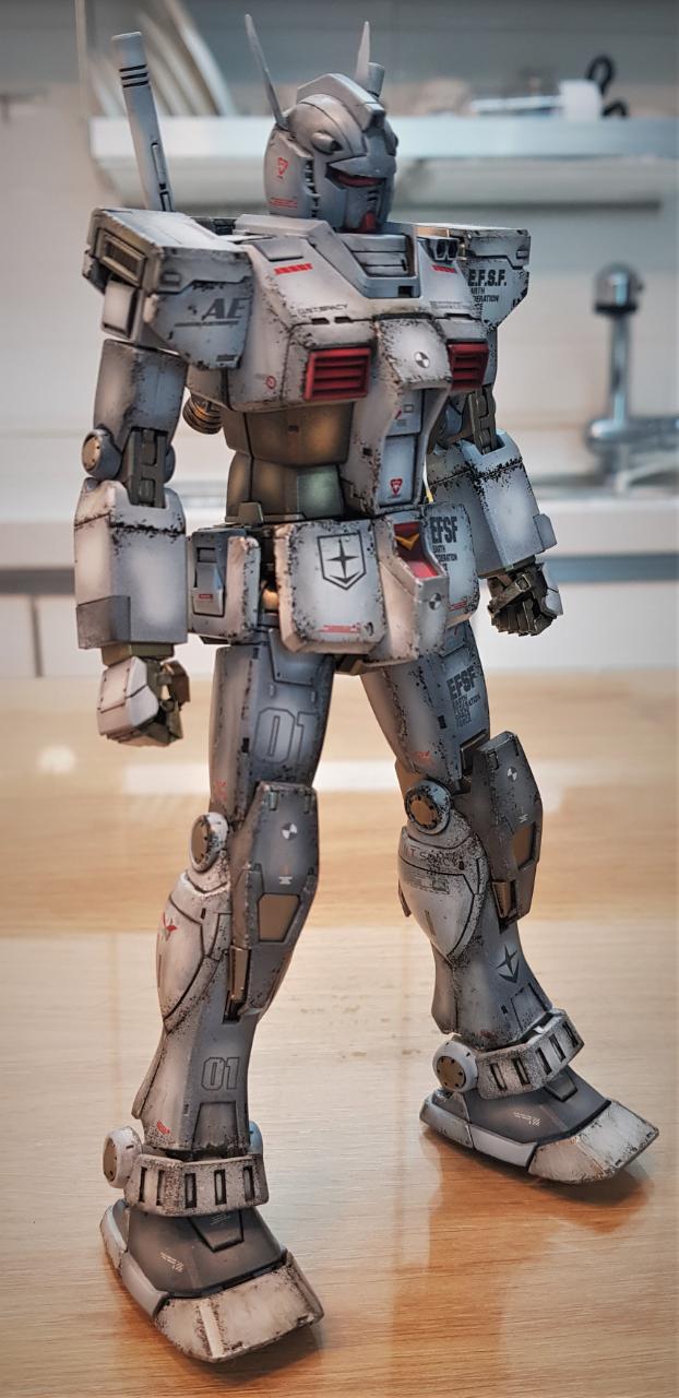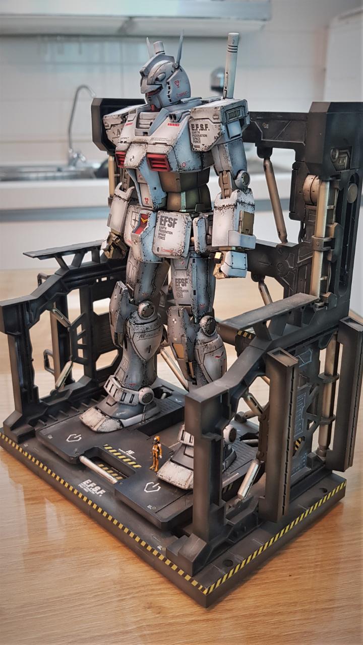 MG 디오리진 버전 퍼스트 건담을 소체로 활용해 개조했습니다. 롤아웃 버전이라고 해서 특별한 것은 아니고, 인터넷에 떠도는 이미지를 참조해, 이마에 붙은 V자 뿔을 없앤 뒤 머리 뒷편으로 옮겼으며, 고관절 스커트 모양을 민짜로 밀어버렸습니다. 그리고 양발 앞쪽 스커트에 사각형 문양을 넣어줬고, 양손은 레진 파츠 남는 것으로 활용했습니다.