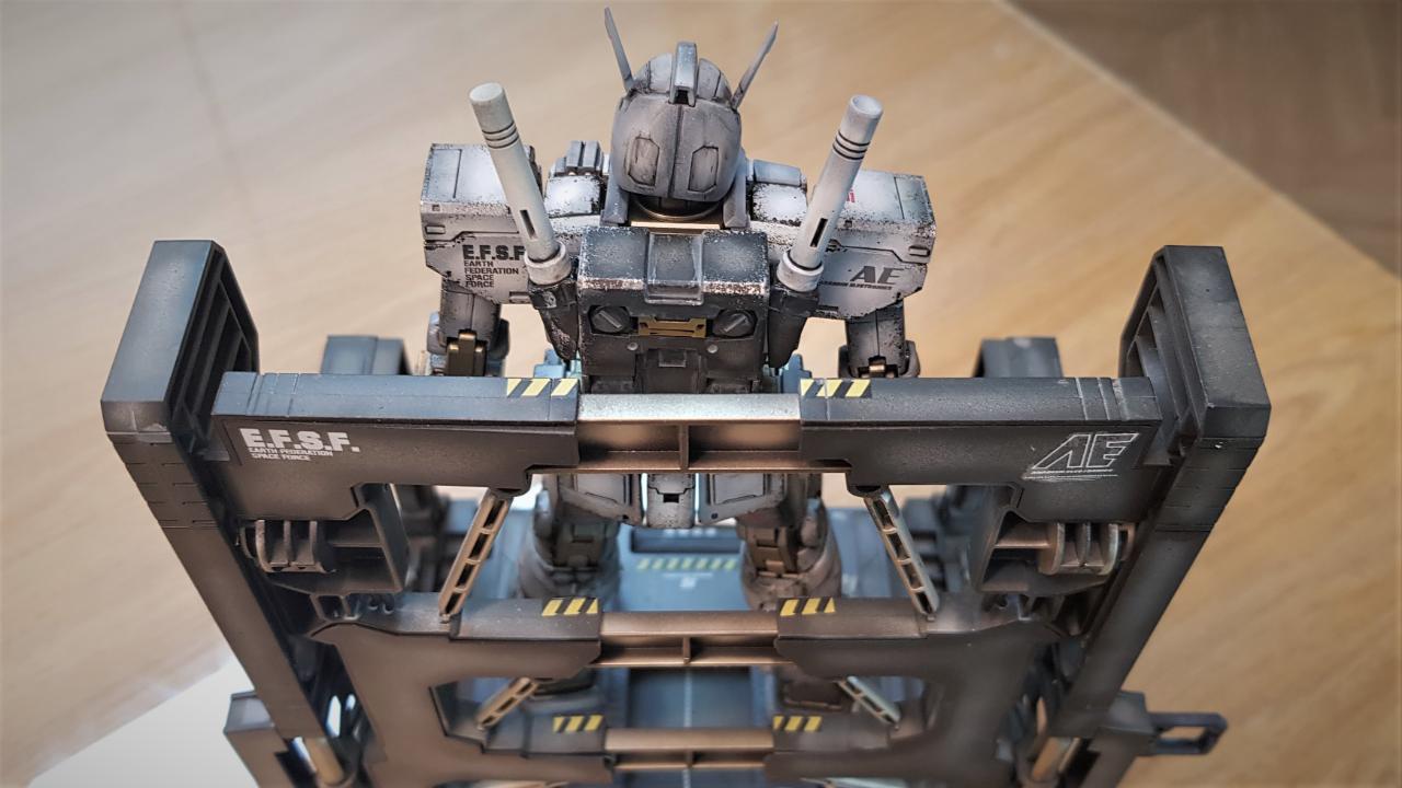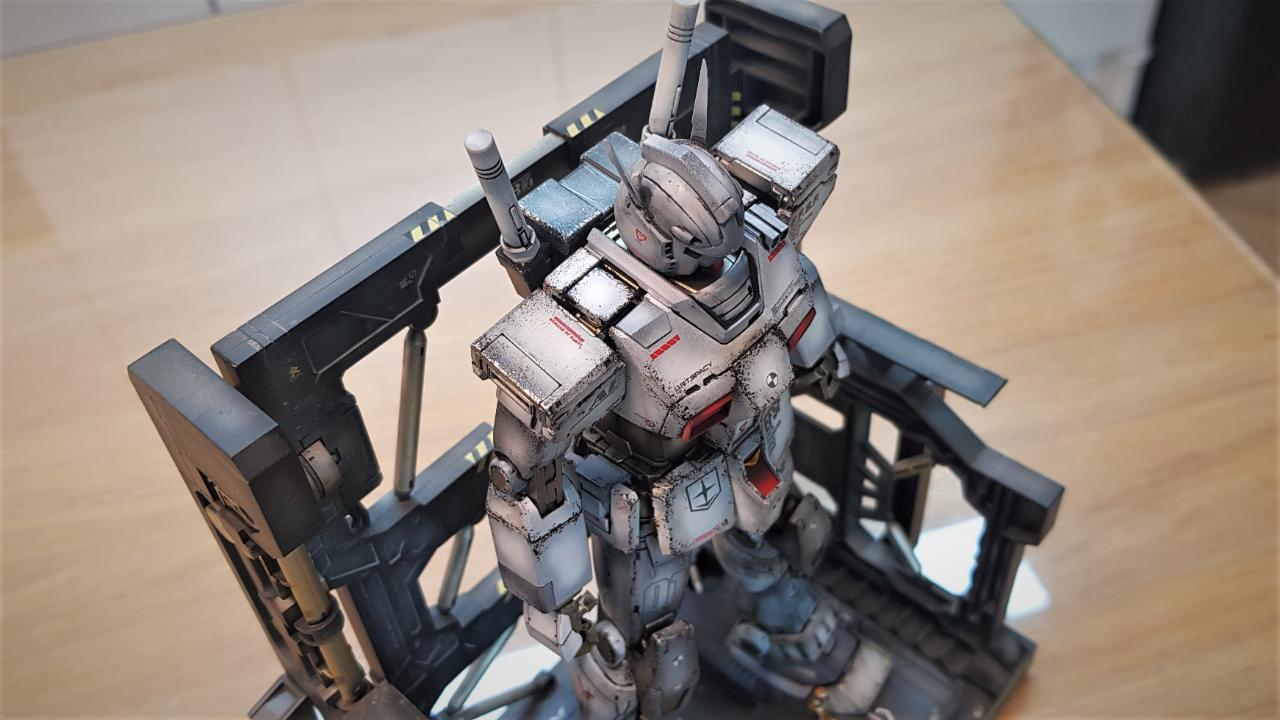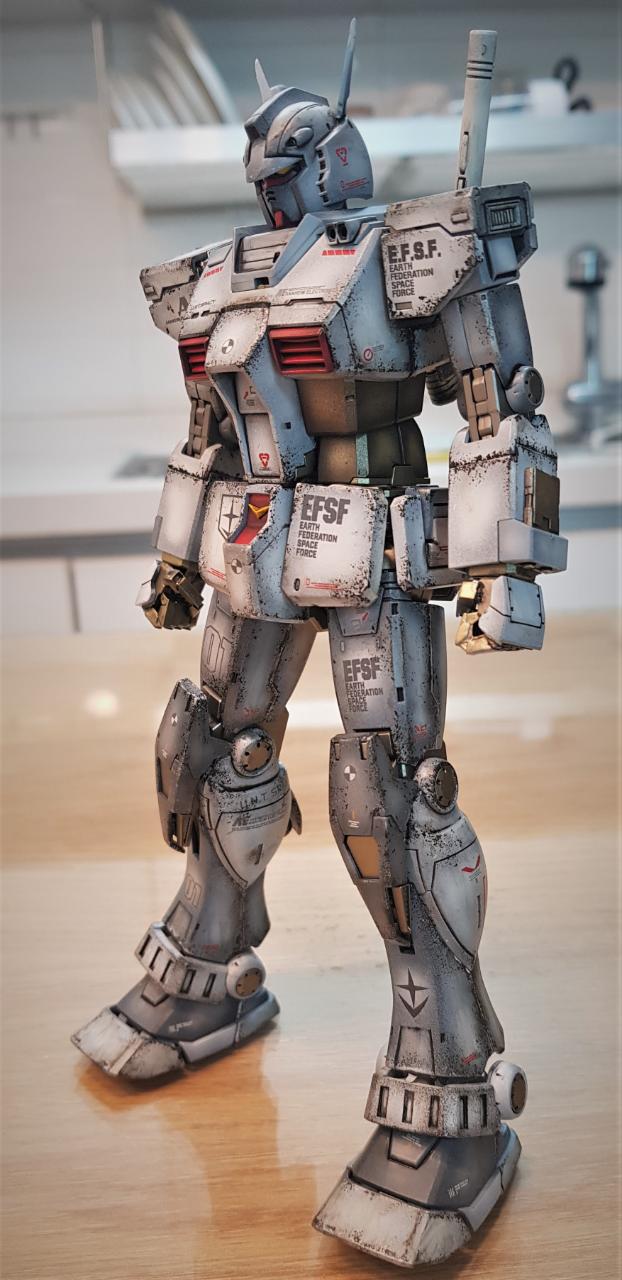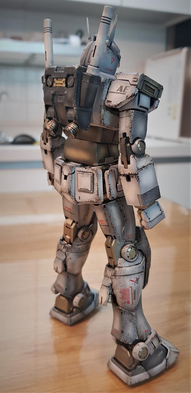 MG 디오리진 버전 퍼스트 건담을 소체로 활용해 개조했습니다. 롤아웃 버전이라고 해서 특별한 것은 아니고, 인터넷에 떠도는 이미지를 참조해, 이마에 붙은 V자 뿔을 없앤 뒤 머리 뒷편으로 옮겼으며, 고관절 스커트 모양을 민짜로 밀어버렸습니다. 그리고 양발 앞쪽 스커트에 사각형 문양을 넣어줬고, 양손은 레진 파츠 남는 것으로 활용했습니다.