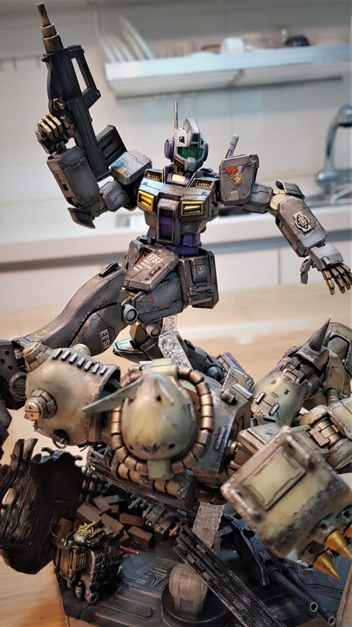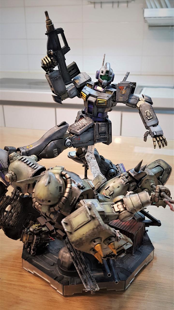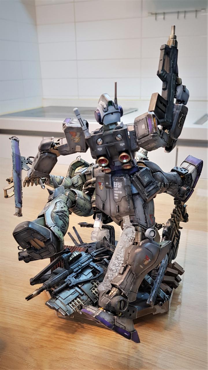짐 한랭지 버젼은 건담 0080에서 남극기지 방어에 등장한 적이 있는데, 전체적인 디테일은 짐 커맨드 버젼과 흡사합니다.. 제작시 패널라인 몇 군데 간단히 파주고 약간의 디테일을 추가했습니다. 색상은 퍼스트 건담 G3버젼과 유사한 색상으로 칠했고, 데칼은 반다이제 중 여러 가지를 섞어서 사용했습니다.