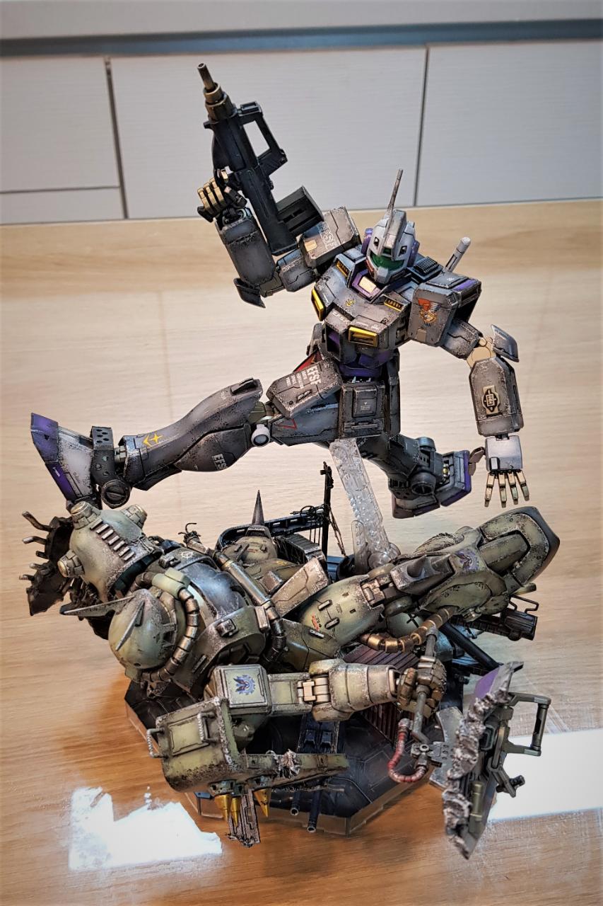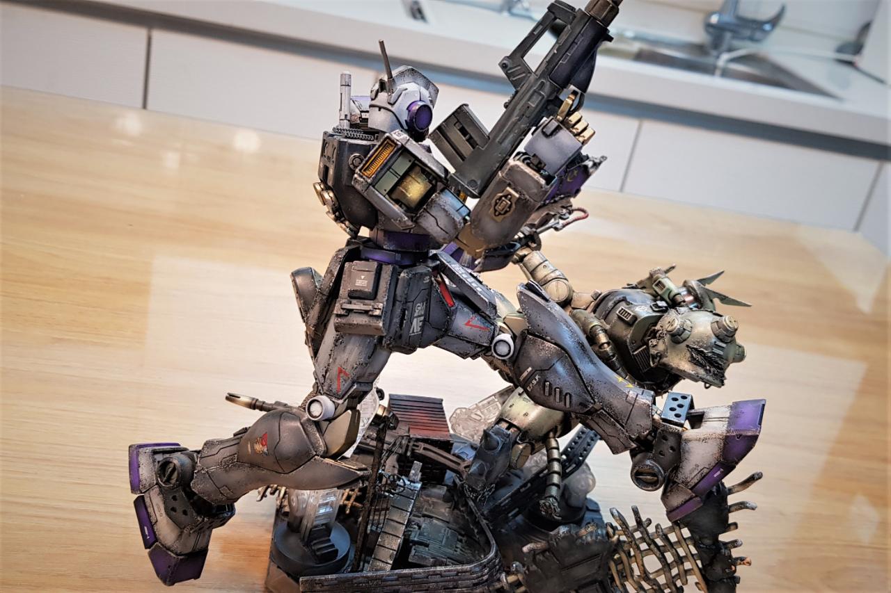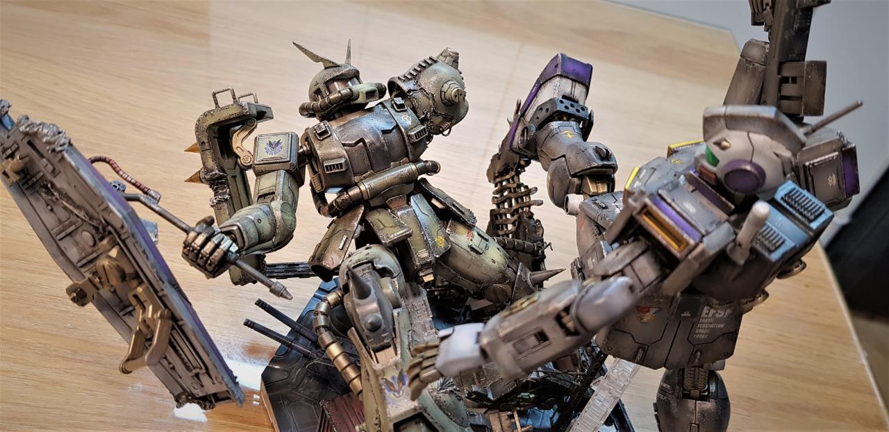 자쿠2 J형은 짐 한랭지 버젼을 위한 조연이라 격파되는 장면으로 구성했습니다. 한쪽 팔/다리를 잘리고, 일부 파손 흔적을 내었습니다. 몇 군데 소소한 디테일도 추가했습니다.