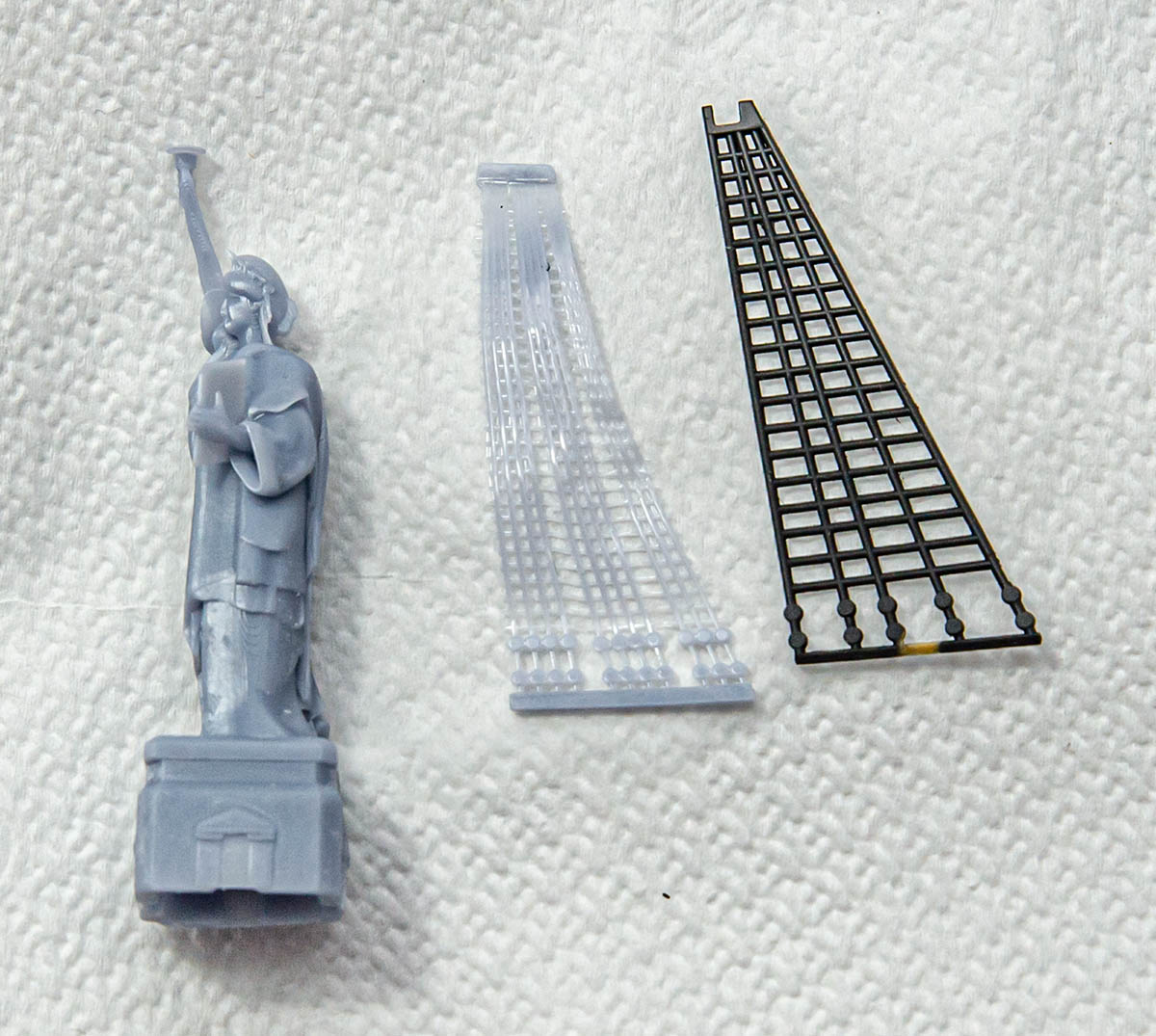 자유의 여신상은 다른 것보다 2배 더 크고 미리 도색이 되어 있기 때문에 별도로 관리하고 있던 건데, 그거 어디에 뒀는지 기억이 안 나더군요; 방 대청소하고 이잡듯이 뒤져도 안 나와서 결국 포기하고, 마침 구입한지 얼마 안 된 SLA 방식 3D 프린터과 인터넷으로 다운로드 받은 자유의 여신상 모델링으로 급히 인쇄해서 땜질했습니다; 2시간 걸려서 인쇄하고 급히 도색하고 헤어드라이기로 말리고 코팅해서 밤 10시에 겨우 완성했습니다. 덕분에 미리 정한 완성일을 어기지 않고 맞췄네요.