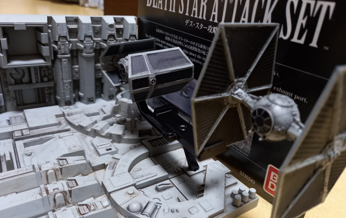 구조물이 볼륨감이 있어 굳이 맥스식 도장을 안하고 기본도색에 먹선 에나멜만 넣어도 훌륭합니다. 제국군 타이파이터는 역시 1/144 반다이 별매입니다. 디오라마에는 X윙 하나만 포함됩니다.