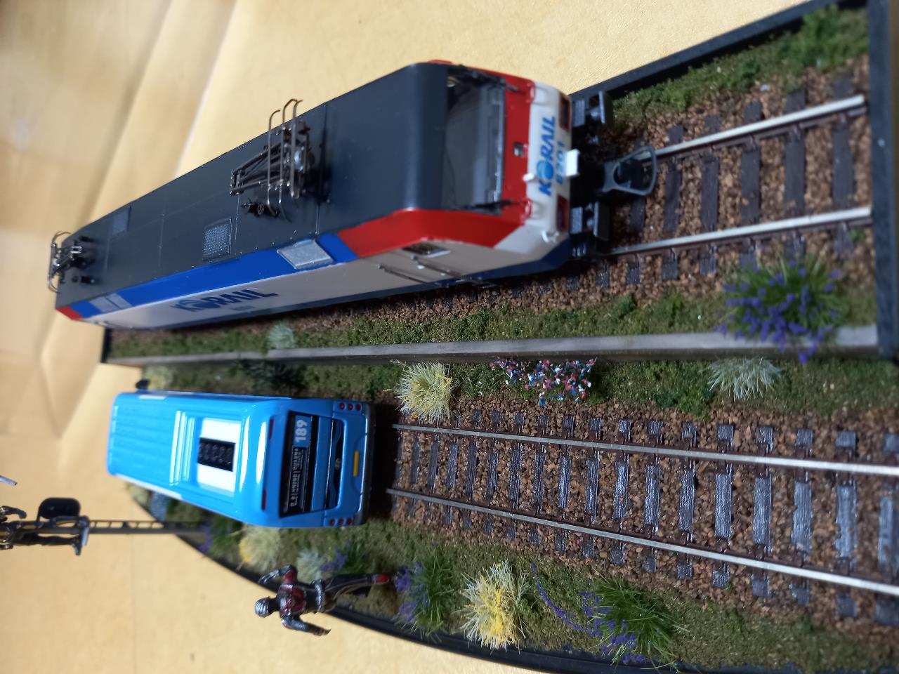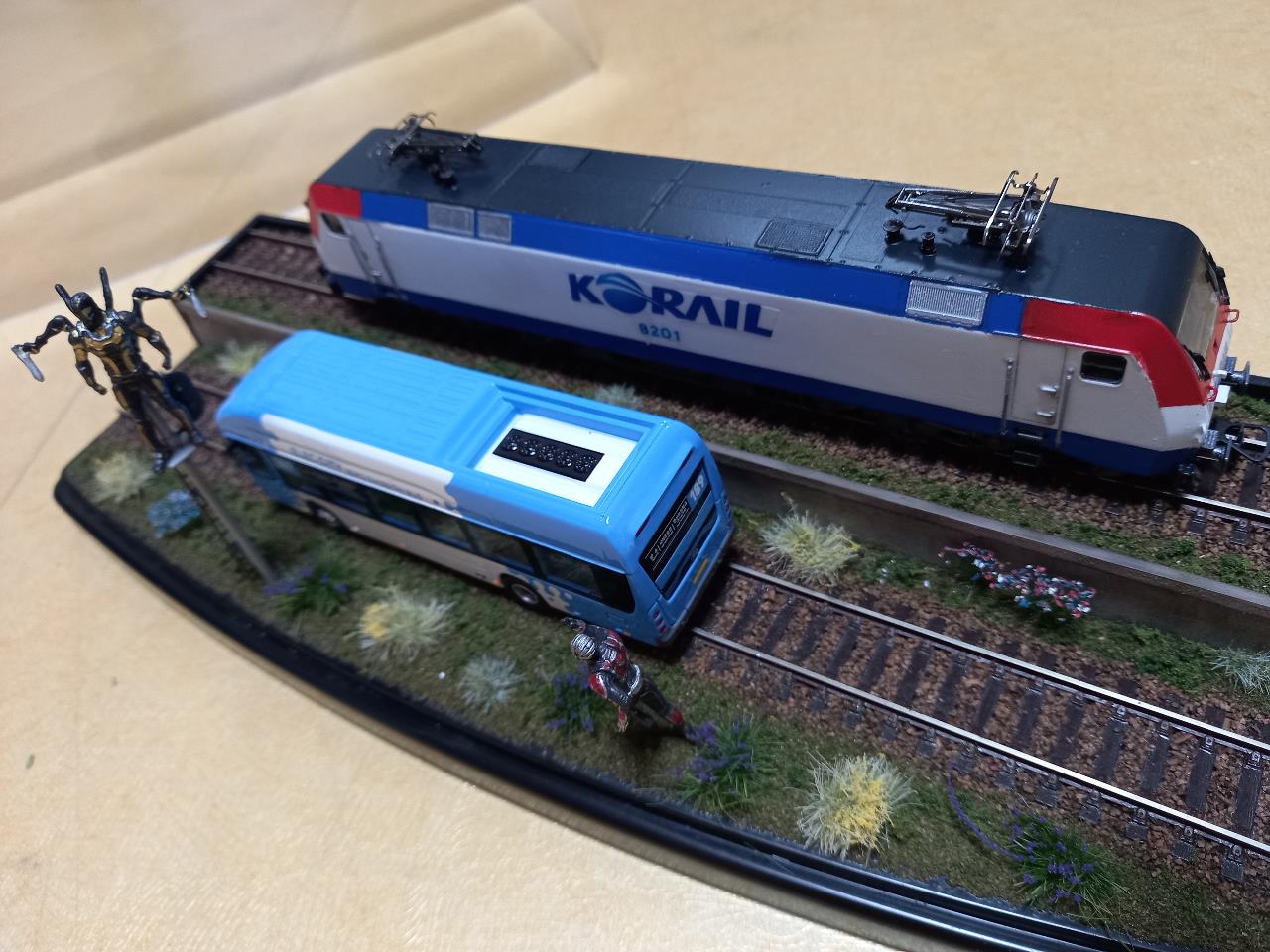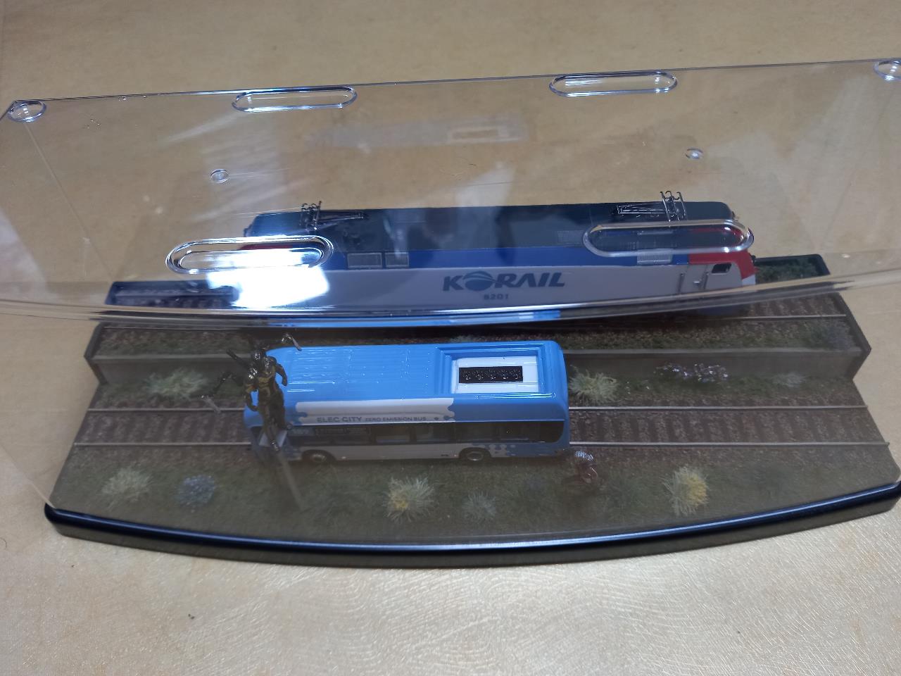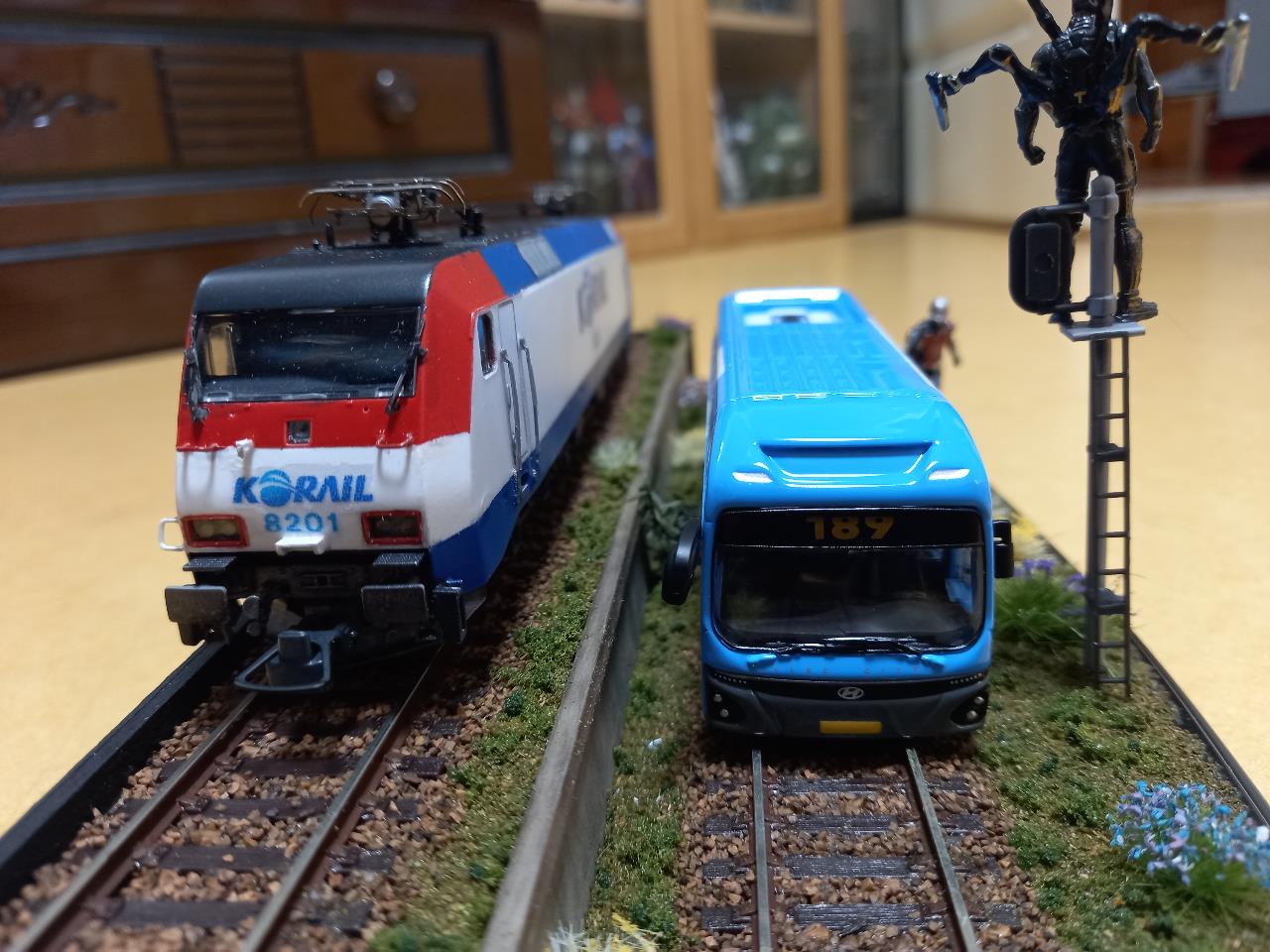 예전에 작업했던 맨땅모형 무궁화호와 현대자동차에서 출시한 HO스케일(1/87) 다이캐스트 완제품버스를 나란히 제작한 비넷에 올려보았습니다.