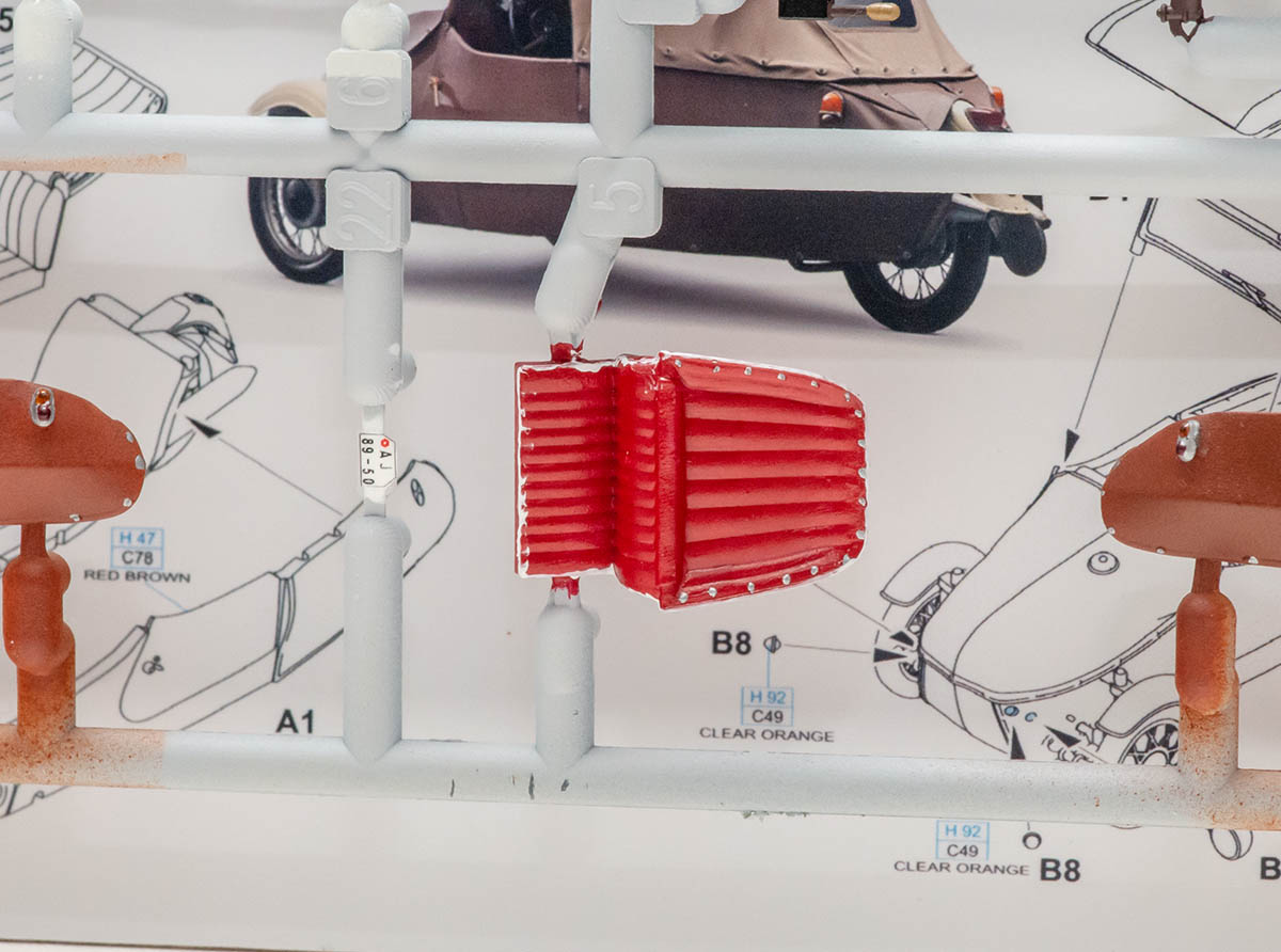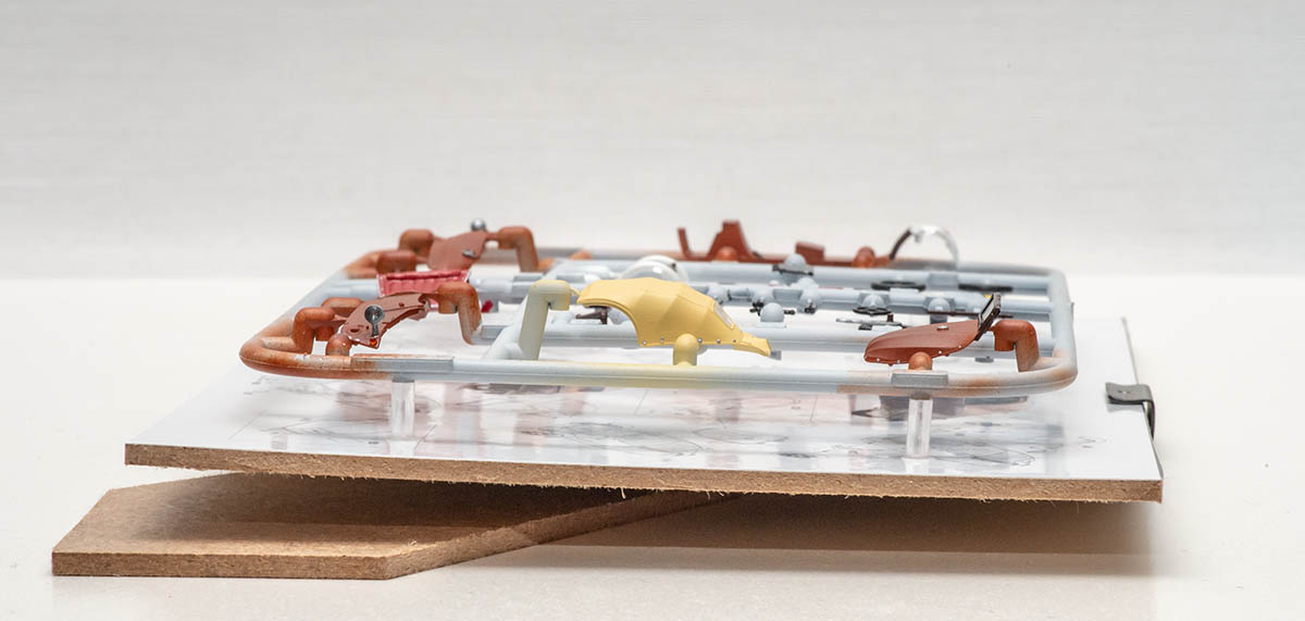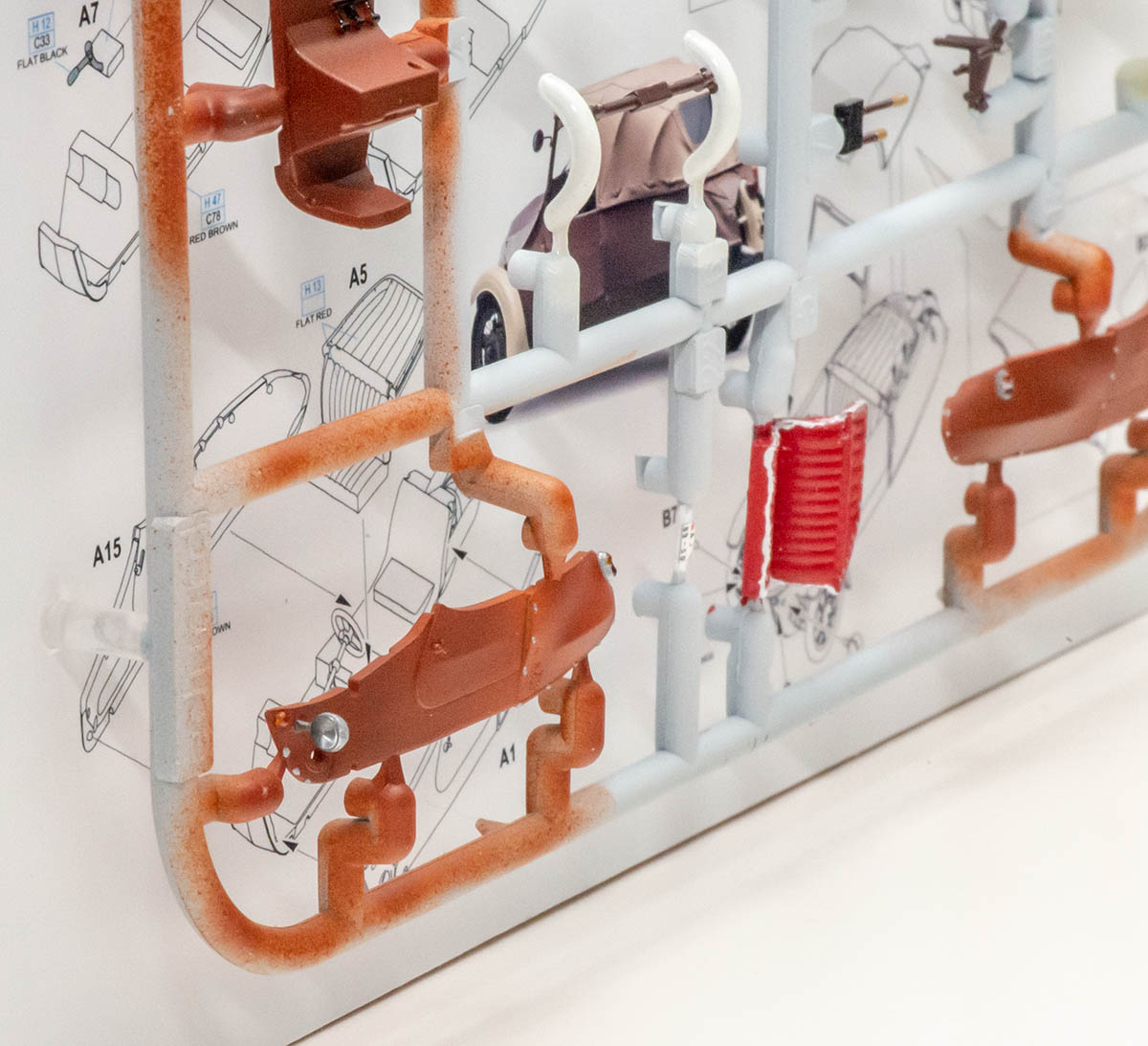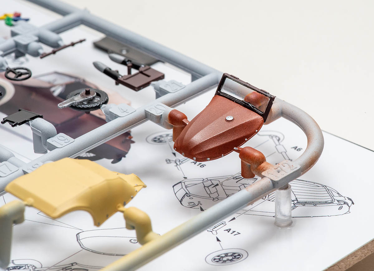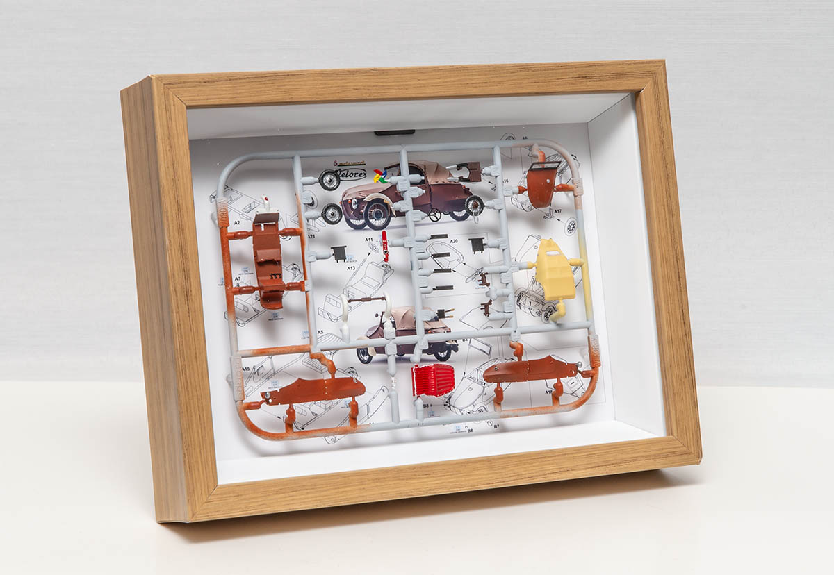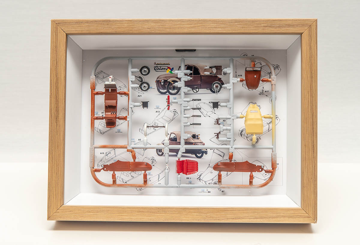 제작에 들어간 키트는 Eduard 의 Velorex 1/72 이며, 원래는 사진의 런너와 투명 런너, 그리고 데칼로 구성된 키트였습니다. 이걸로 어떻게 보기 좋게 액자로 만들까 고민을 거듭하다가, 궂이 모든 런너를 살리는 것에 집착하지 않고 위와 같이 하나의 런너로 데칼까지 모조리 다 조립해넣었습니다. 설명서도 런너보다 크기 때문에 축소 편집해서 뒤에 붙여줬죠.