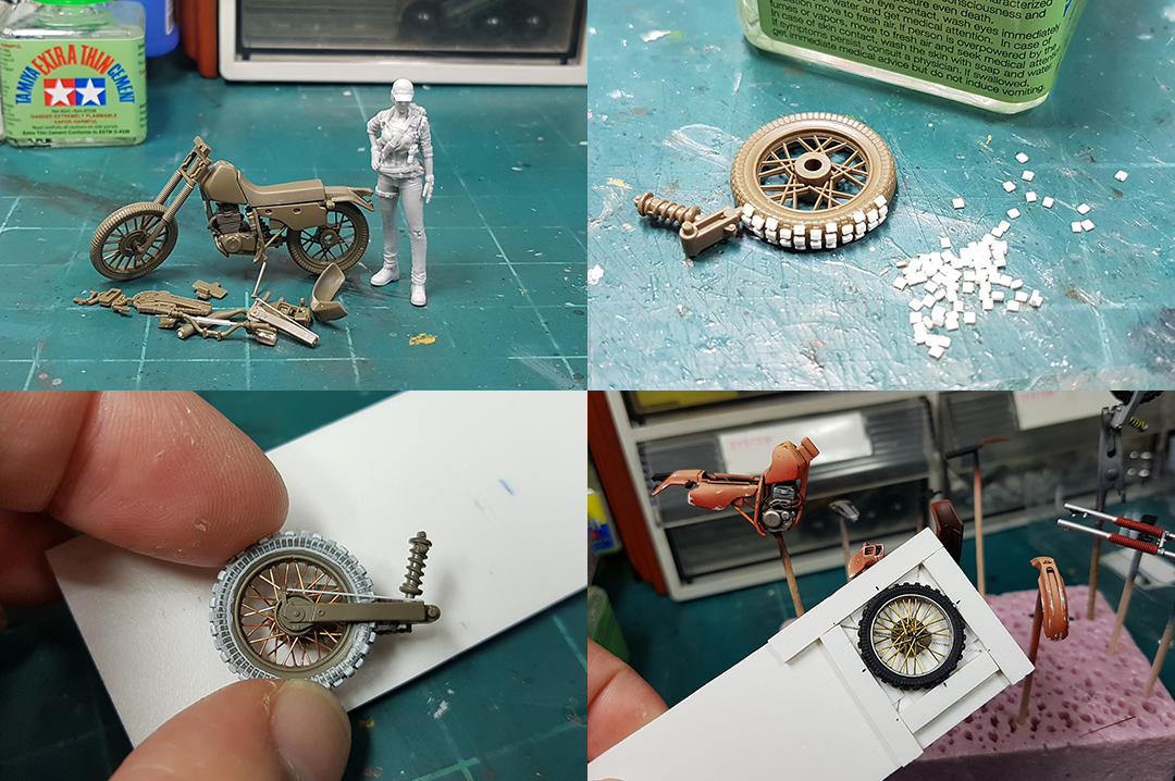 가장 마음에 안들었던 바퀴살은 0.3mm 황동봉으로 새로 만들어주었는데 실제 모양과는 다릅니다. 갯수도 뒷바퀴는 80%, 앞바퀴는 60%만 재현했습니다.
