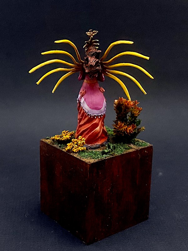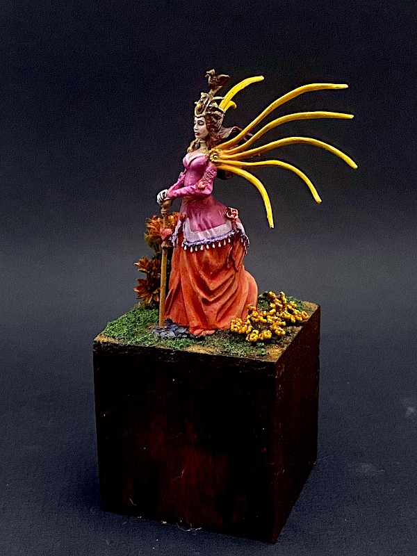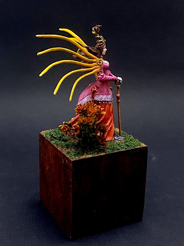 Darksword Miniatures에서 나온 28mm scale, Queen of Hearts입니다. 미니 높이(머리 위 새 포함)는 약 50mm 정도입니다. 나무 블럭 하나 색칠해서 받침대를 만들어 주었습니다.