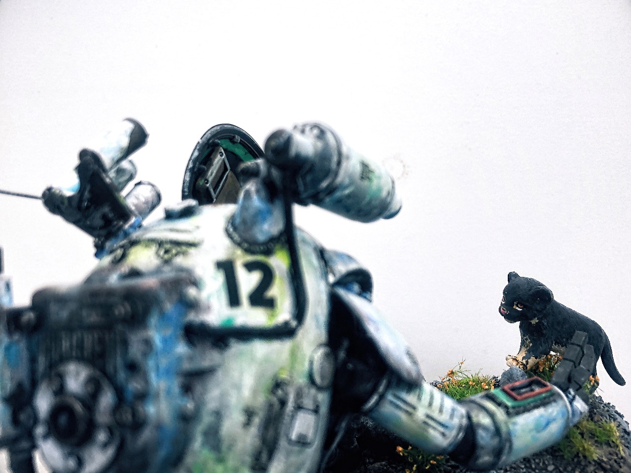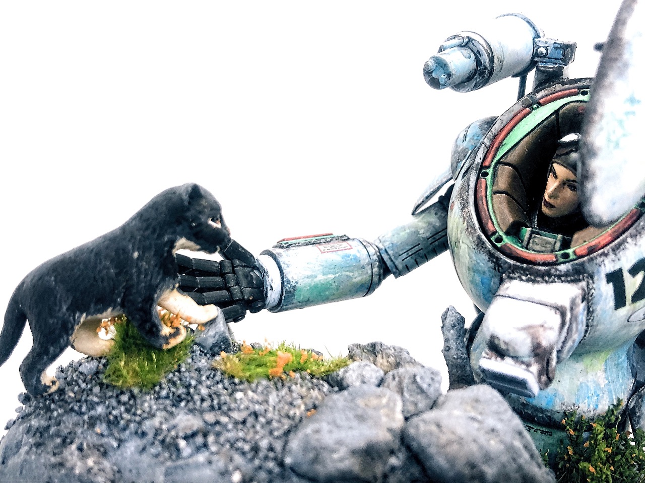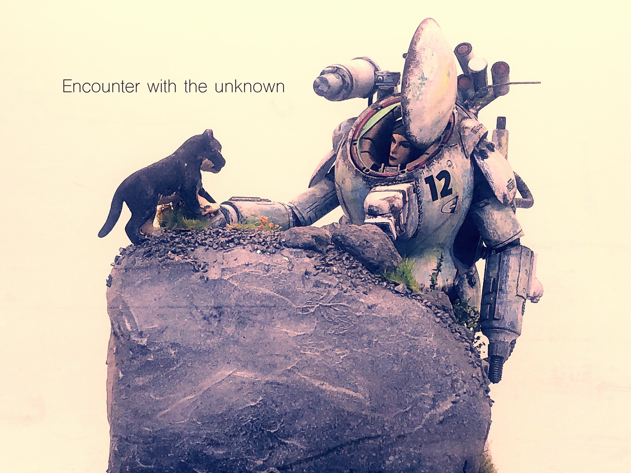 황폐화 된 지구에서 정찰중이던 용병군 병사가 고양이과 맹수의 새끼를 난생 처음 보는 장면을 묘사해 봤습니다.