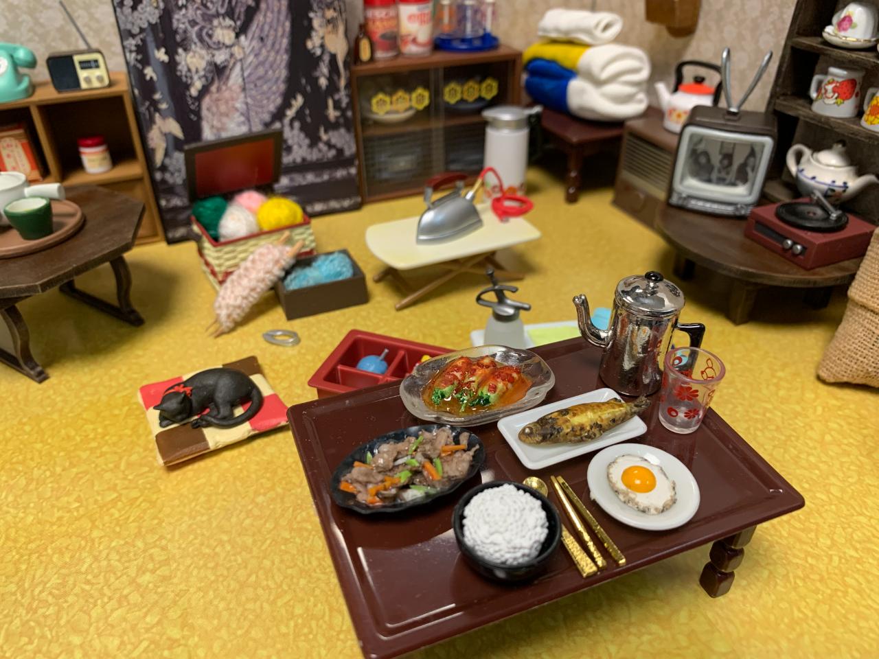 반찬은 생선구이, 불고기, 총각김치, 계란후라이.. 점토로 만들었습니다. (저 뒤의 이불도..)