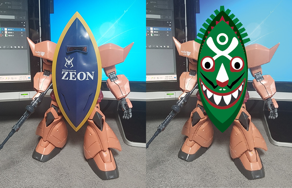 아주 단순하게 머드맨 가면과 겔구그 방패 모양이 비슷하다는데에서 출발했습니다.
