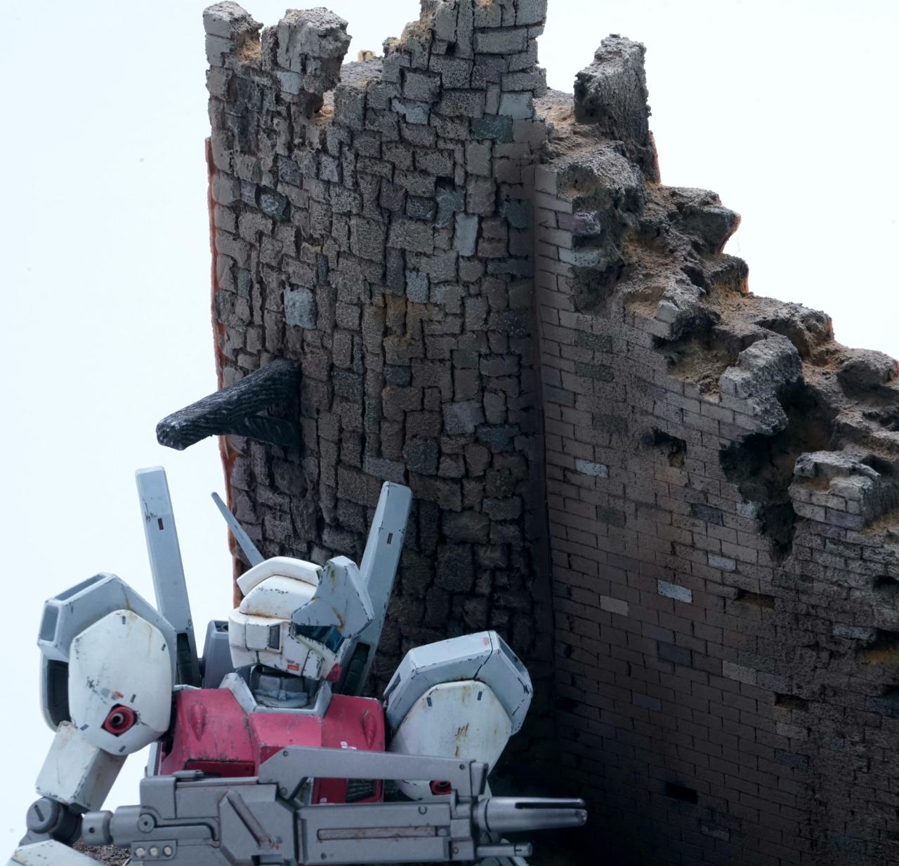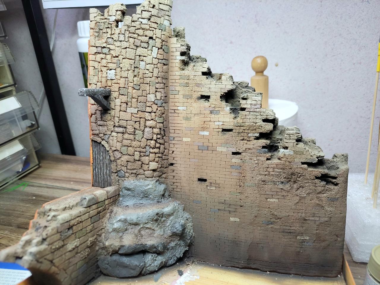 벽돌. 석조 무늬는 자와 볼펜을 이용해 나타내주고 무너진 건물은 뾰족한 수술용 메스로 벽돌을 도려내듯이 뜻어내 주었습니다.