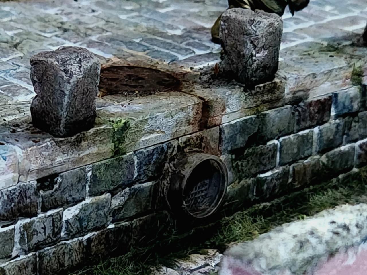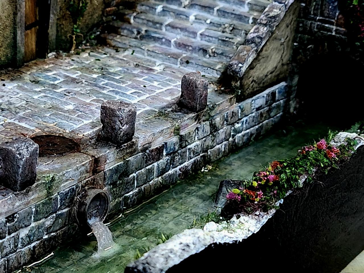 베이스에 도로와 계단 하수구 벽면 돌담 등 같은듯하면서 다른 표현 다른 공법을 사용했습니다