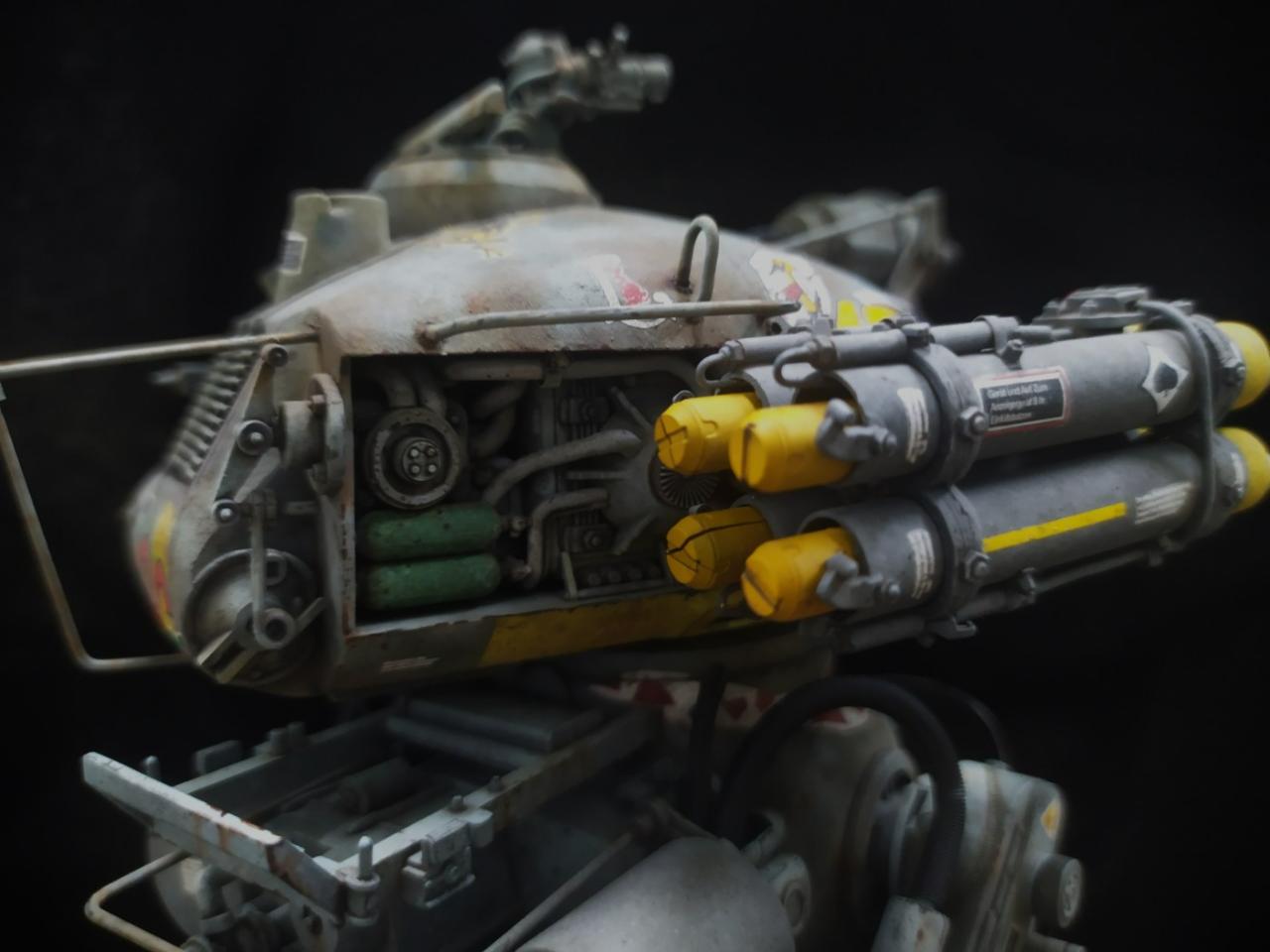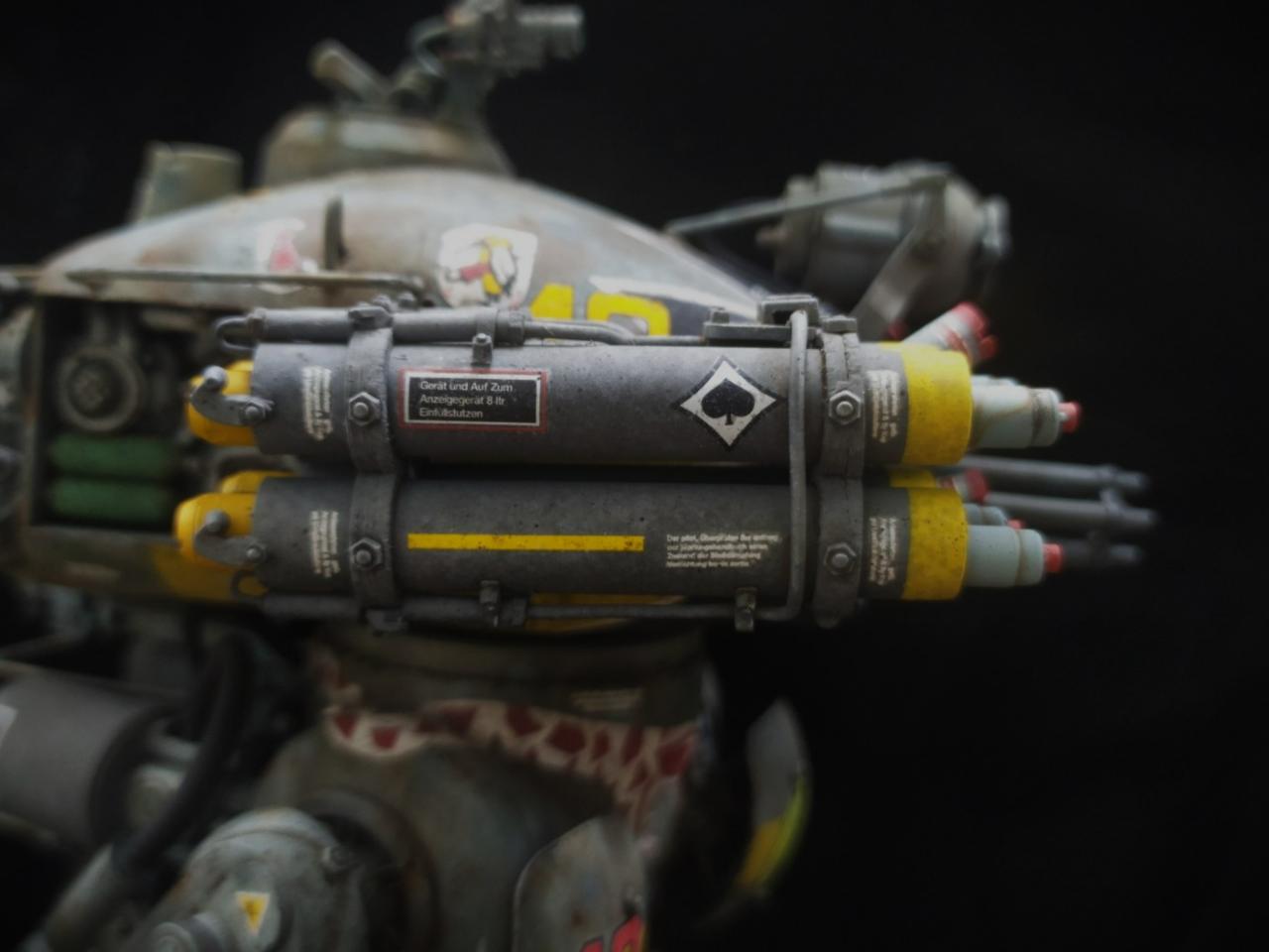 포탑 측면에 4연발 로켓 런처를 설치하여 대형기체에 대응한다는 설정입니다. - 황통 튜브를 5cm의 길이로 절단하여 4개씩 묶어서 한 덩어리로 만들고, 프라봉과 알루미늄선, 에칭쪼가리, 인젝션 볼트 등을 이용하여 디테일 표현하고 로켓은 소형 주사기와 건담 파츠로 제작했습니다.