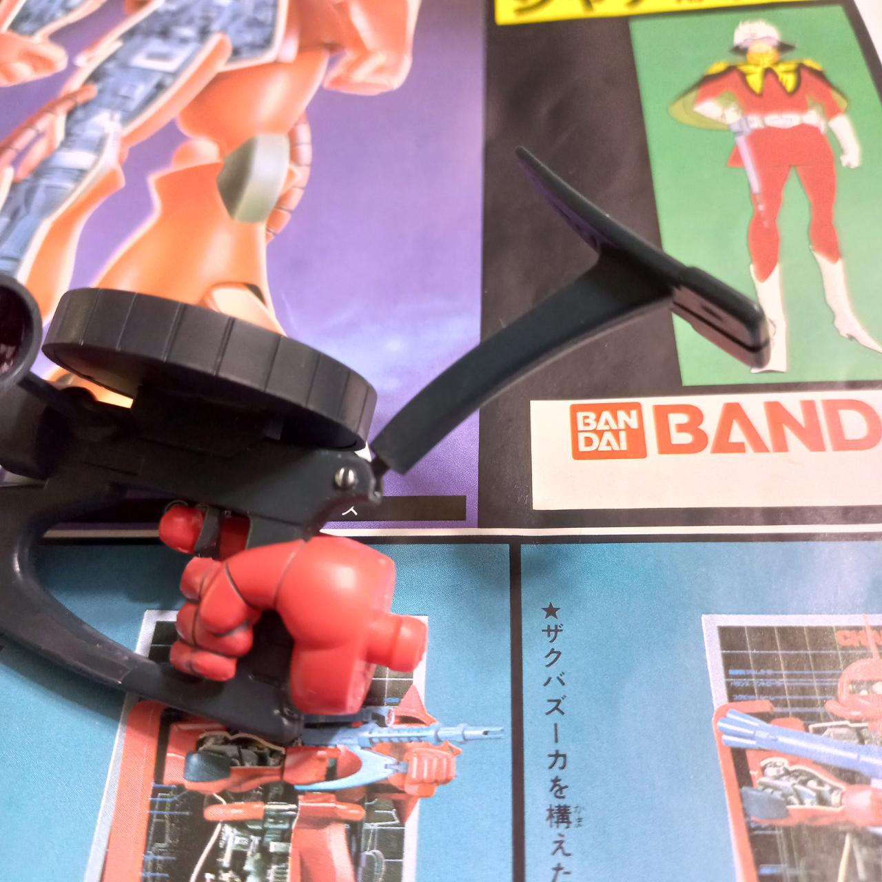 80년대 초기 자쿠 프라는 머신건을 양손으로 쥐면 꼭 벌 받는 것 처럼 팔동작이 어색합니다. 또 그런 포즈를 하면 안에 사야도 가리게 되어서, 한손으로 편하게 쥘 수 있게 개머리판을 접을 수 있게 했습니다.