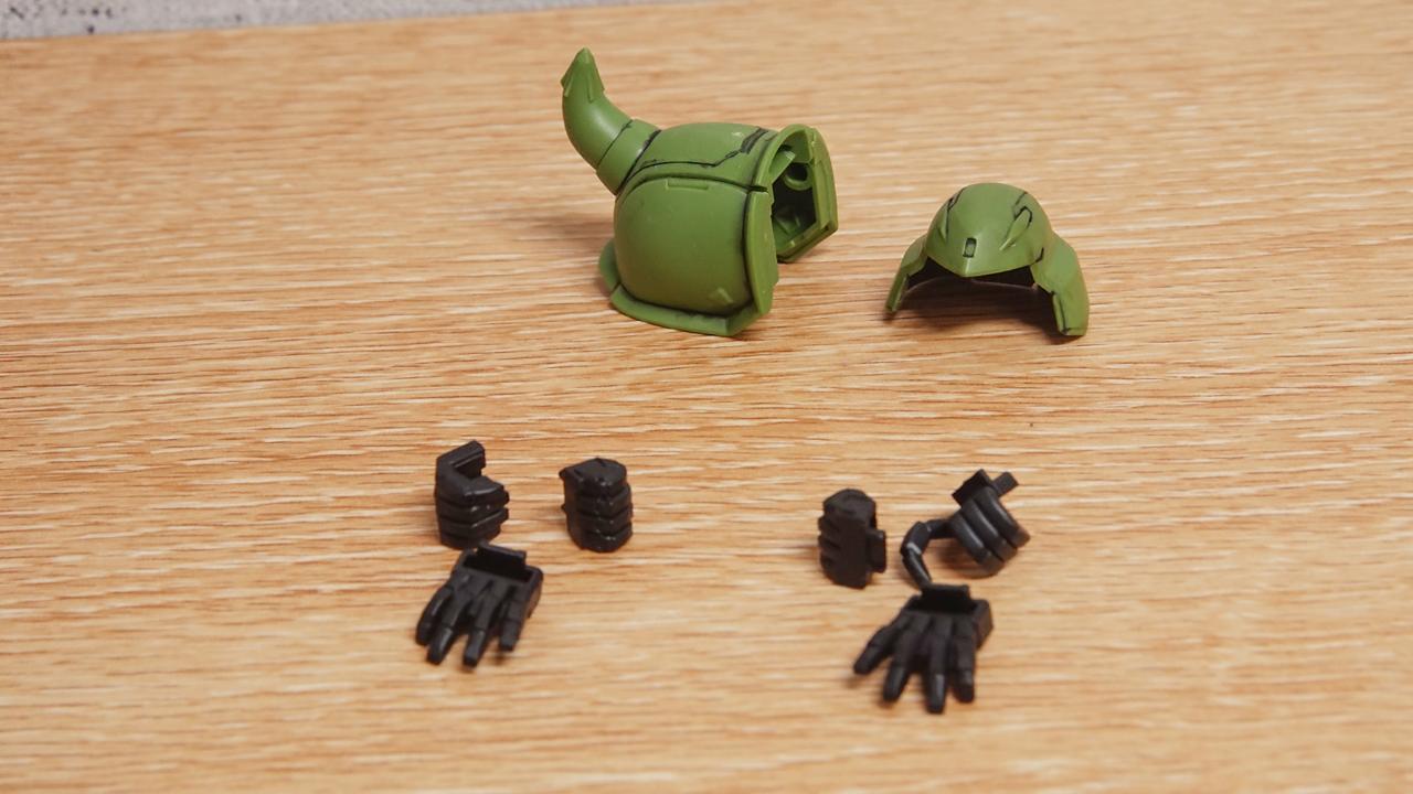 양 손의 파츠들과 일반 자쿠 워리어를 재현하기 위한 스파이크 달린 어깨 갑옷 한개와 투구가 남습니다. 원래는 탄창 한 개와 히트 호크도 하나 남았는데 리뷰를 찾아보니 원래 설정에선 방패에 수납할 수 있다고 하더라구요. 아마 블레이즈 자쿠 워리어는 방패가 두개니까 히트 호크도 두개를 주었던 모양입니다. 그런데 이펙트 파츠는 한 개분이라... 결국 런너 버려주면서 같이...
