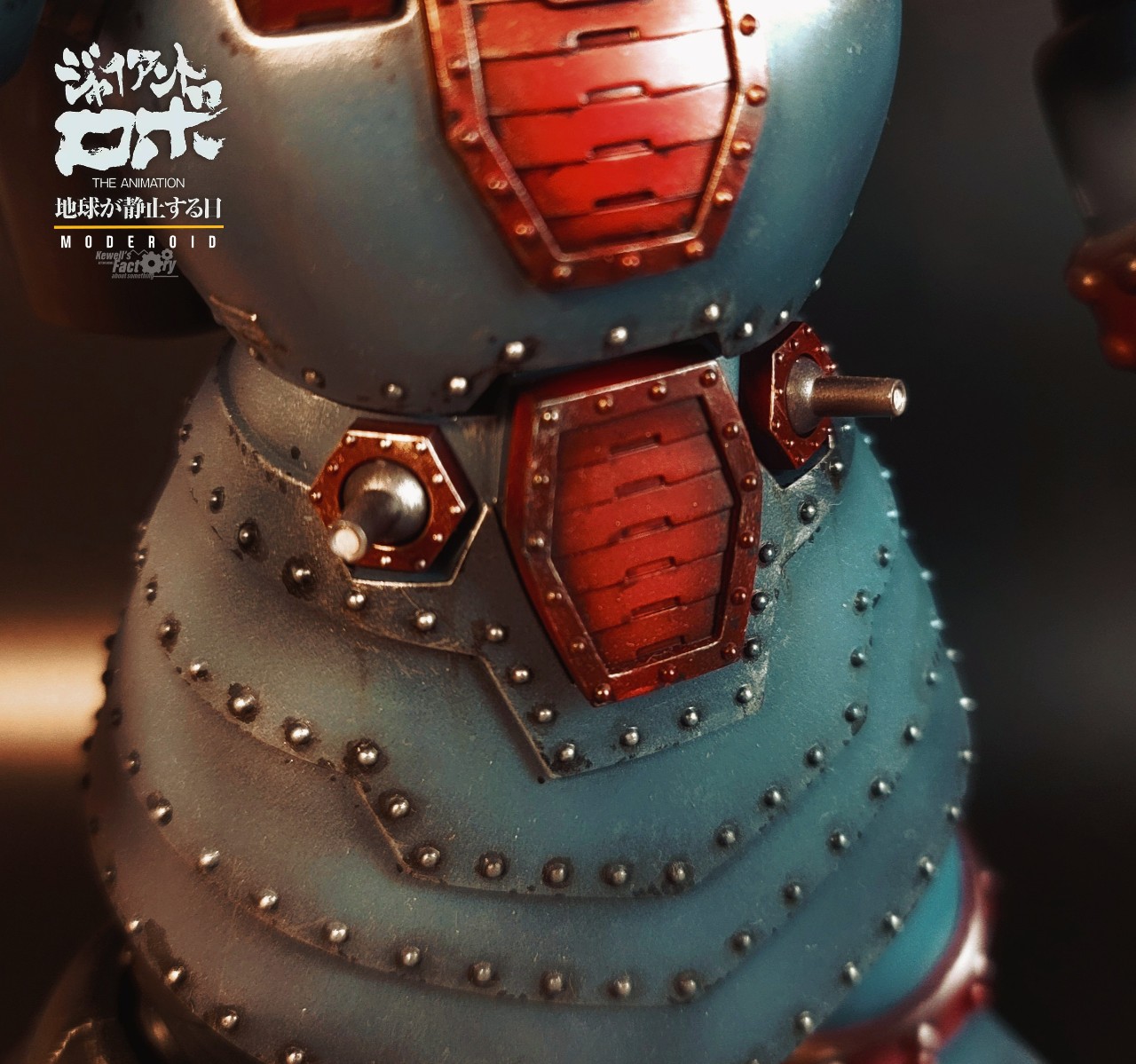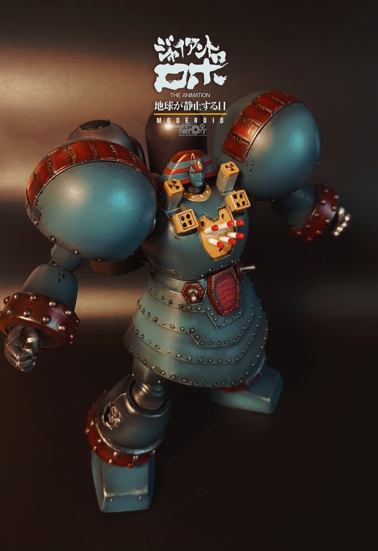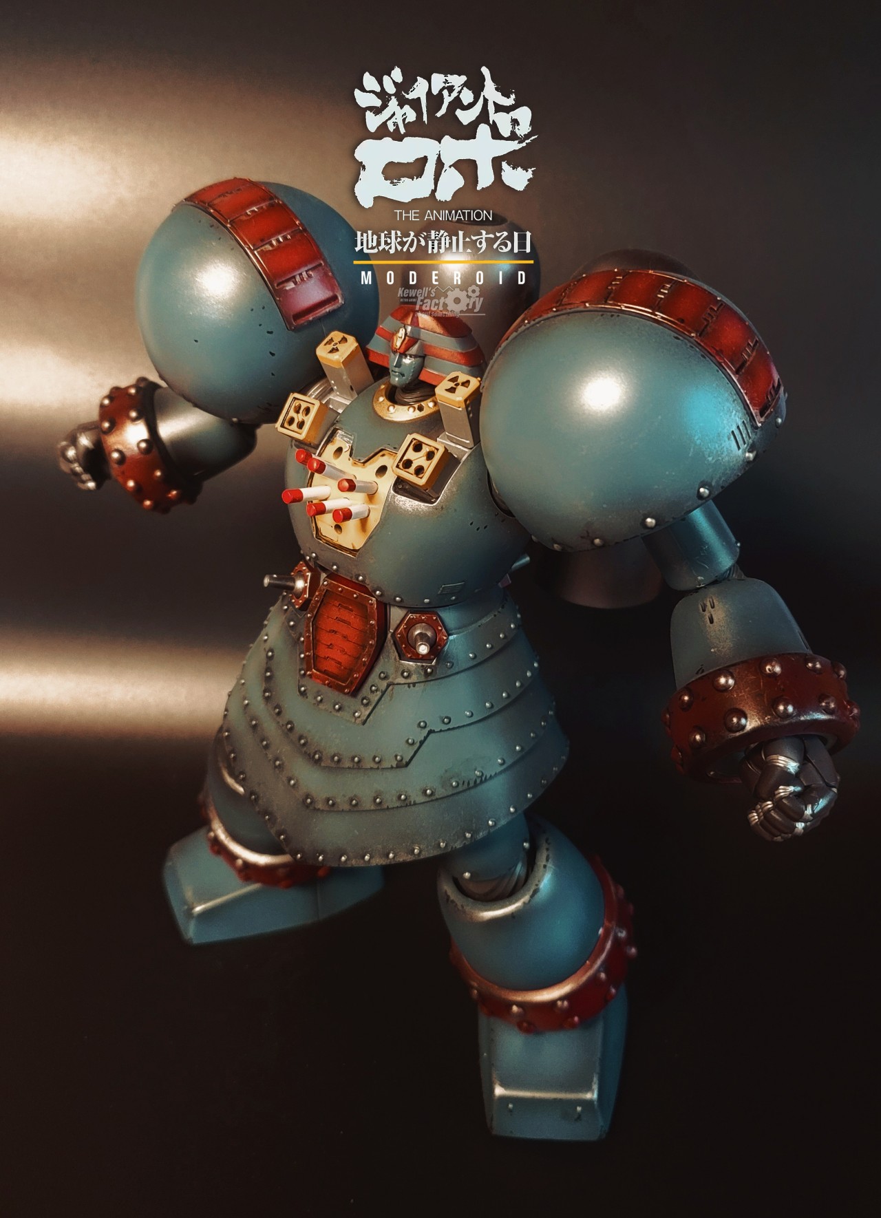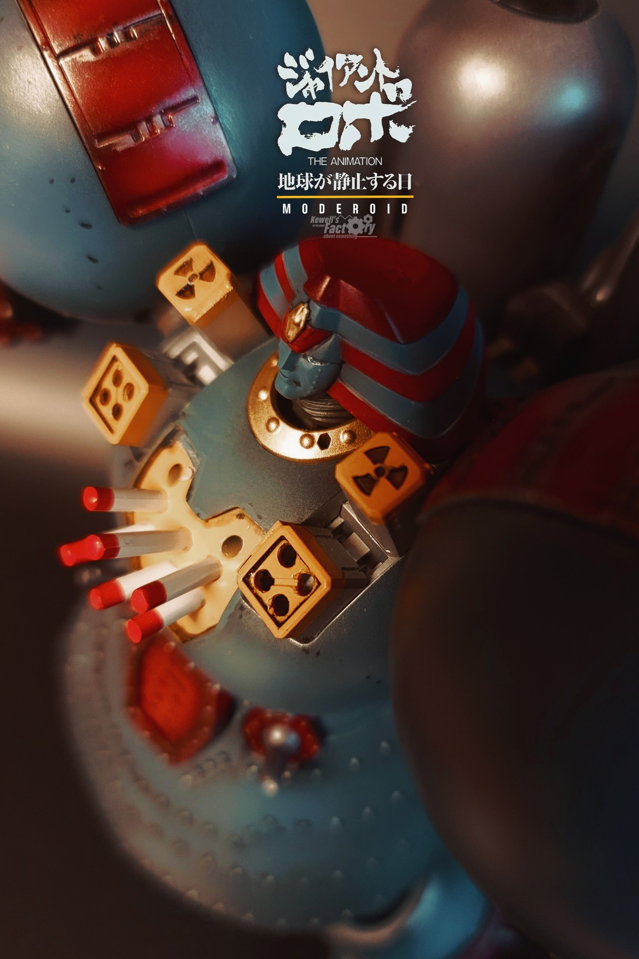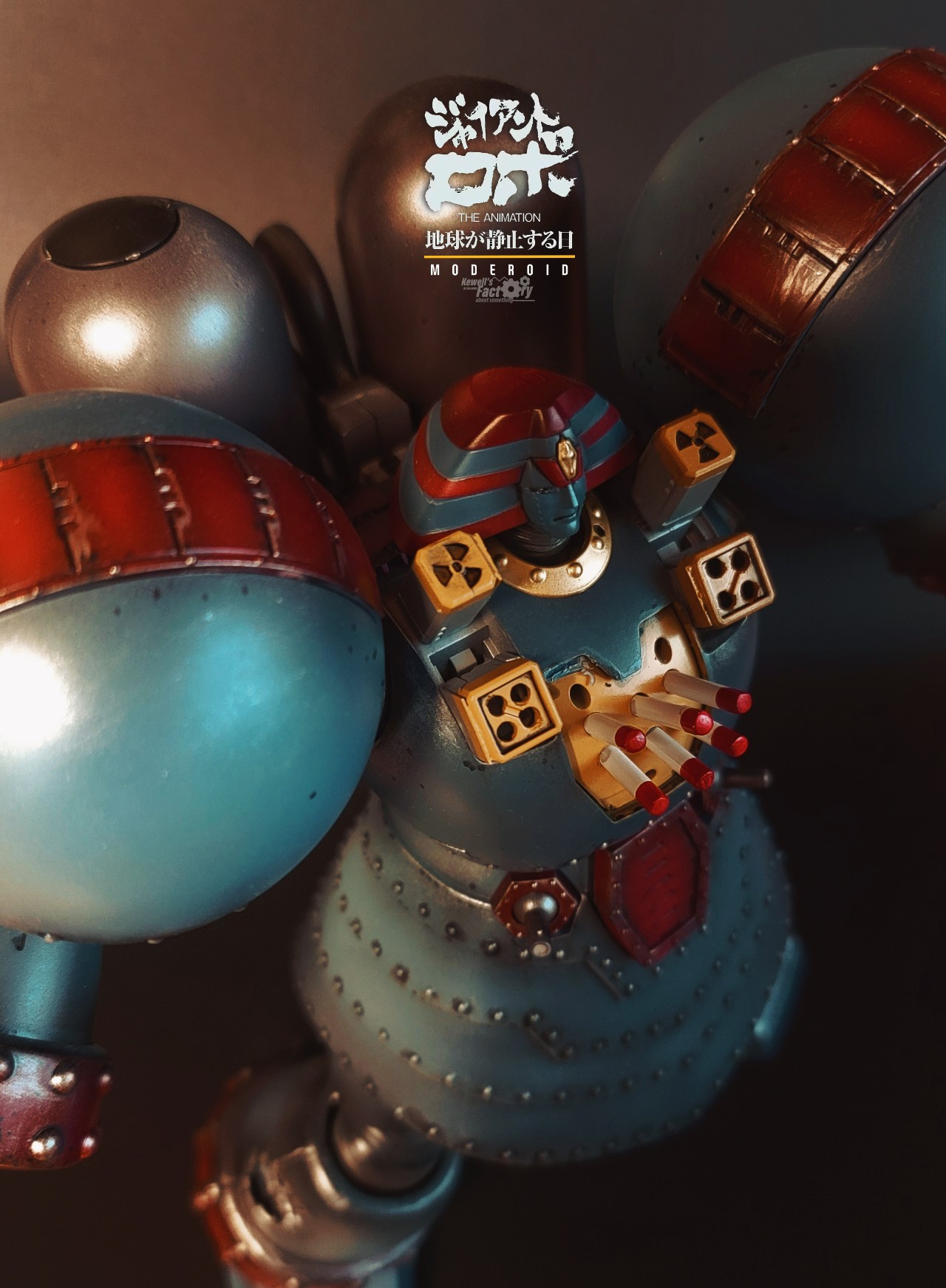 제품에는 설정되어 있지 않은 설정을 몇몇가지 추가했습니다. 어깨쪽 미사일포드와 원폭슬롯을 추가해줬고 가슴쪽에 미사일셋을 추가로 만들어서 달아줬씁니다. 원래 자이언트로보가 무장셋이 없는 그냥 몸통박치기형 로봇처럼 느껴지겠지만 사실은 무장이 많습니다. 특히 로보가 전탄 발사하는 장면이 극중에 나오기 때문에 이런 설정이 매우 매력적이죠. 사실 제품킷에 이런 파츠들이 있기를 바랬는데 없어서 그냥 제가 자체 제작해봤습니다.