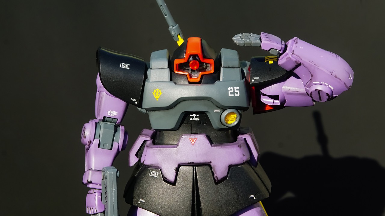 확산 빔포만 타미야 아크릴 무광 노랑으로 붓도색 해줬습니다. 모노아이는 역시나 비즈 스티커로 바꿔주었구요. 그 외엔 스트레이트 빌딩에 무도색, 단지 지난 MG 구프처럼 파스텔과 Mig제 아크릴 치핑을 사용해서 간단하게 심심해보이지 않도록 웨더링을 표현해보았습니다.