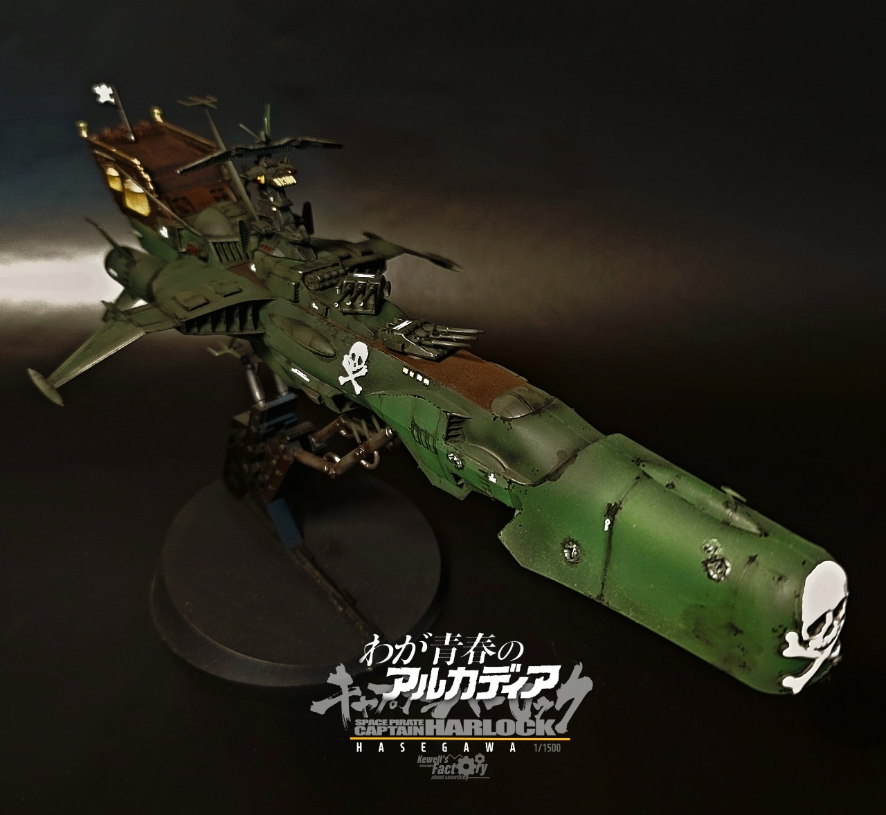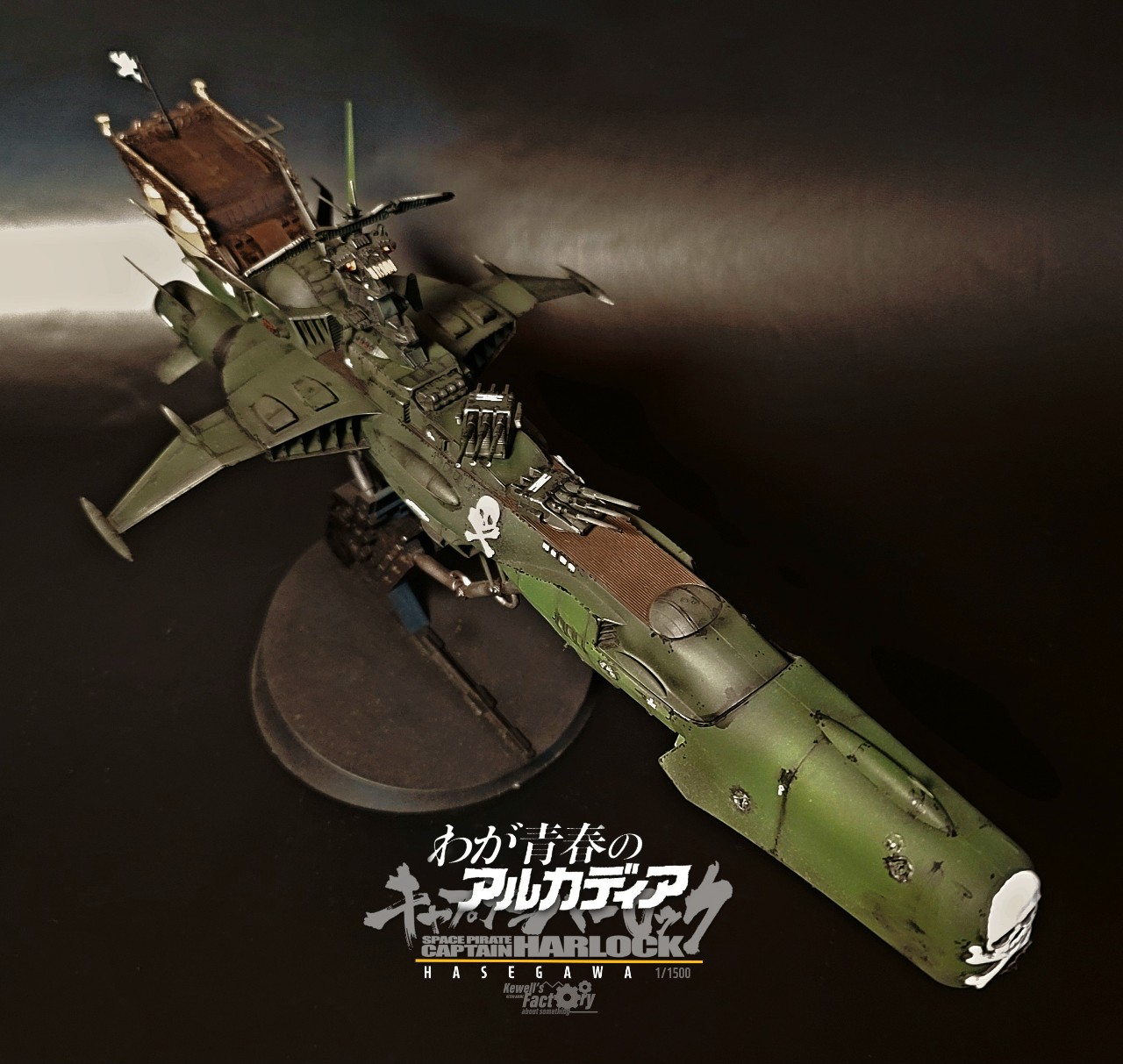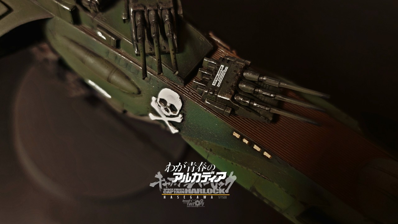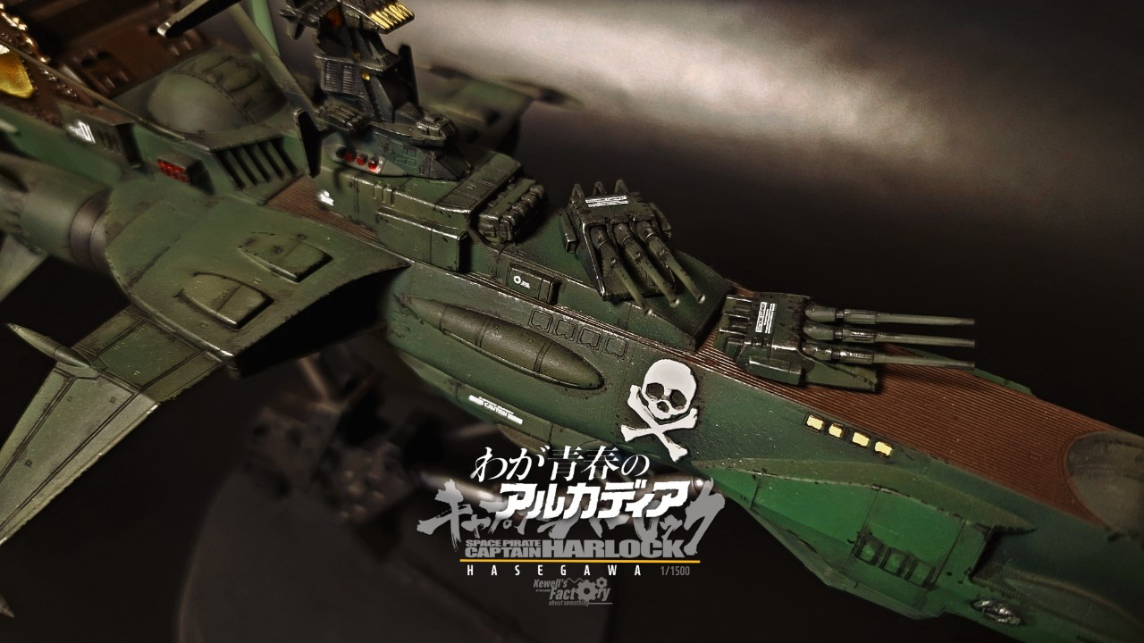아르카디아호는 TV판이었던 세컨쉽보다 퍼스트쉽이 레이지버스에서 주로 많이 등장해서 이 전함이 더 존재감이 있기도 하고, 또 은하철도999 세계관과도 연결이 된 전함이어서 이 전함으로 작업을 진작부터 해보리라고 생각했었습니다. 다만 그냥 도색을 하기보다는 전장에서 많은 전투를 겪은 모습의 하드한 스타일로 시도했고, 그에 따라 웨더링을 비롯해서 곳곳에 함포 데미지를 적용해서 터프하게 묘사했습니다. 바디 톤은 선두와 바디에 채도톤을 달리해서 앞쪽 선두가 좀 밝은 계통의 다크그린이고 선미쪽으로 갈수록 짙어지도록 했구요. (이게 설정집을 보니까 미묘하게 톤이 이원화 되어있더라구요)
