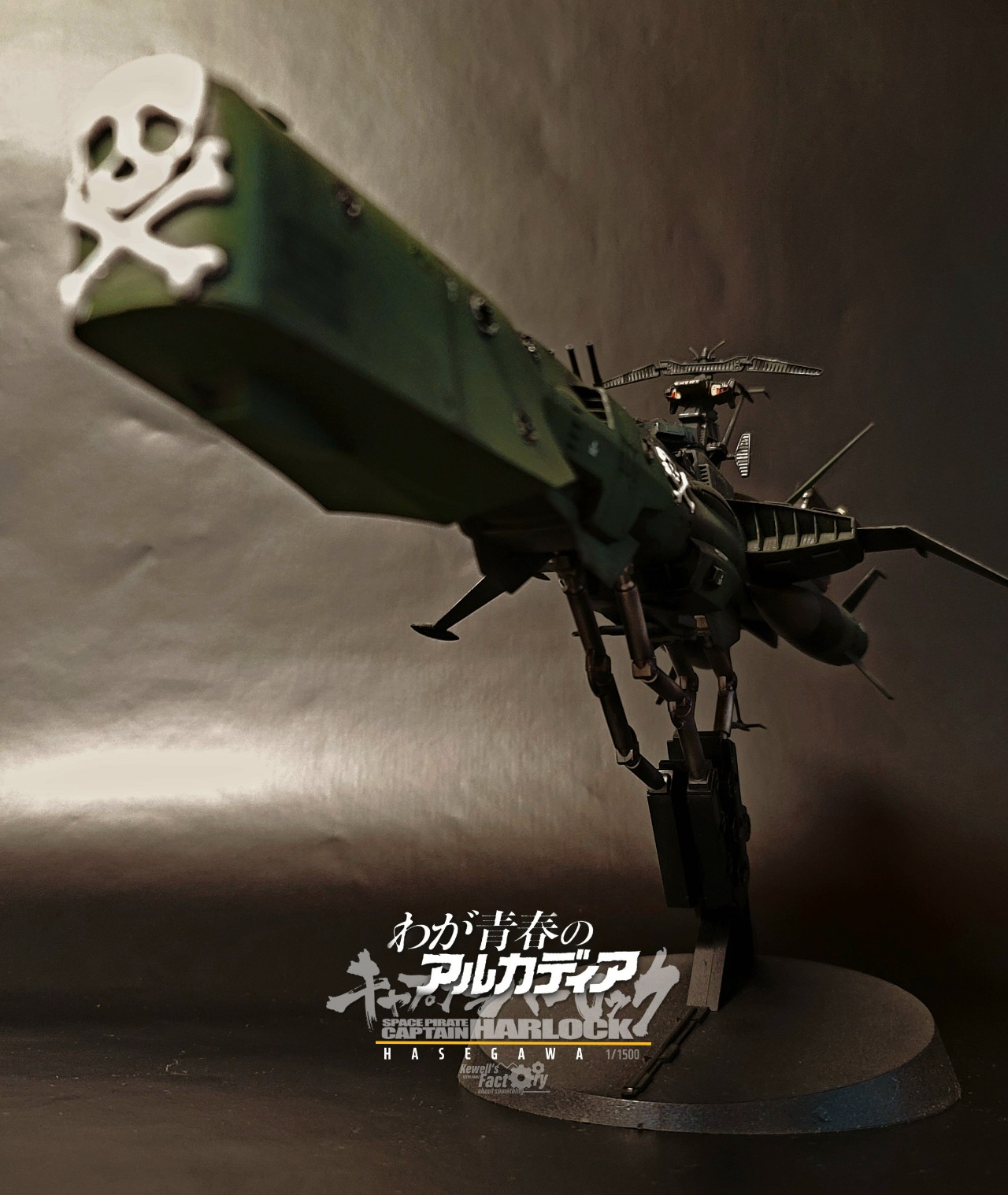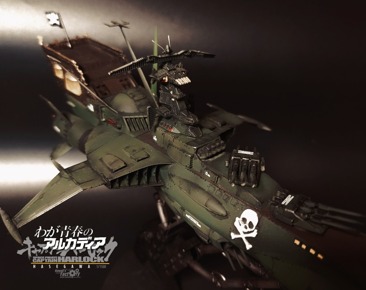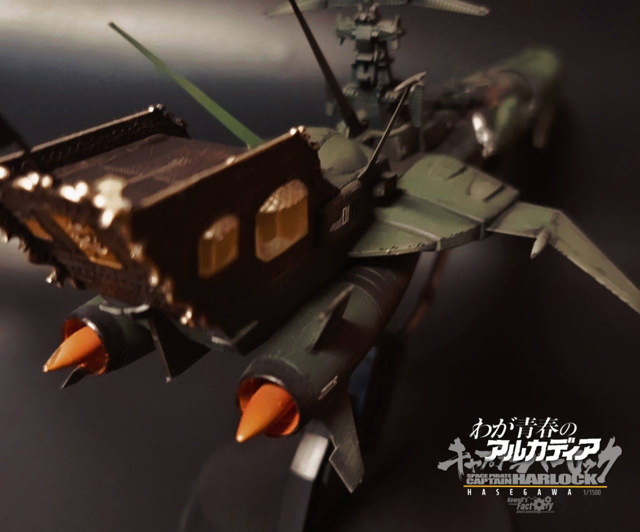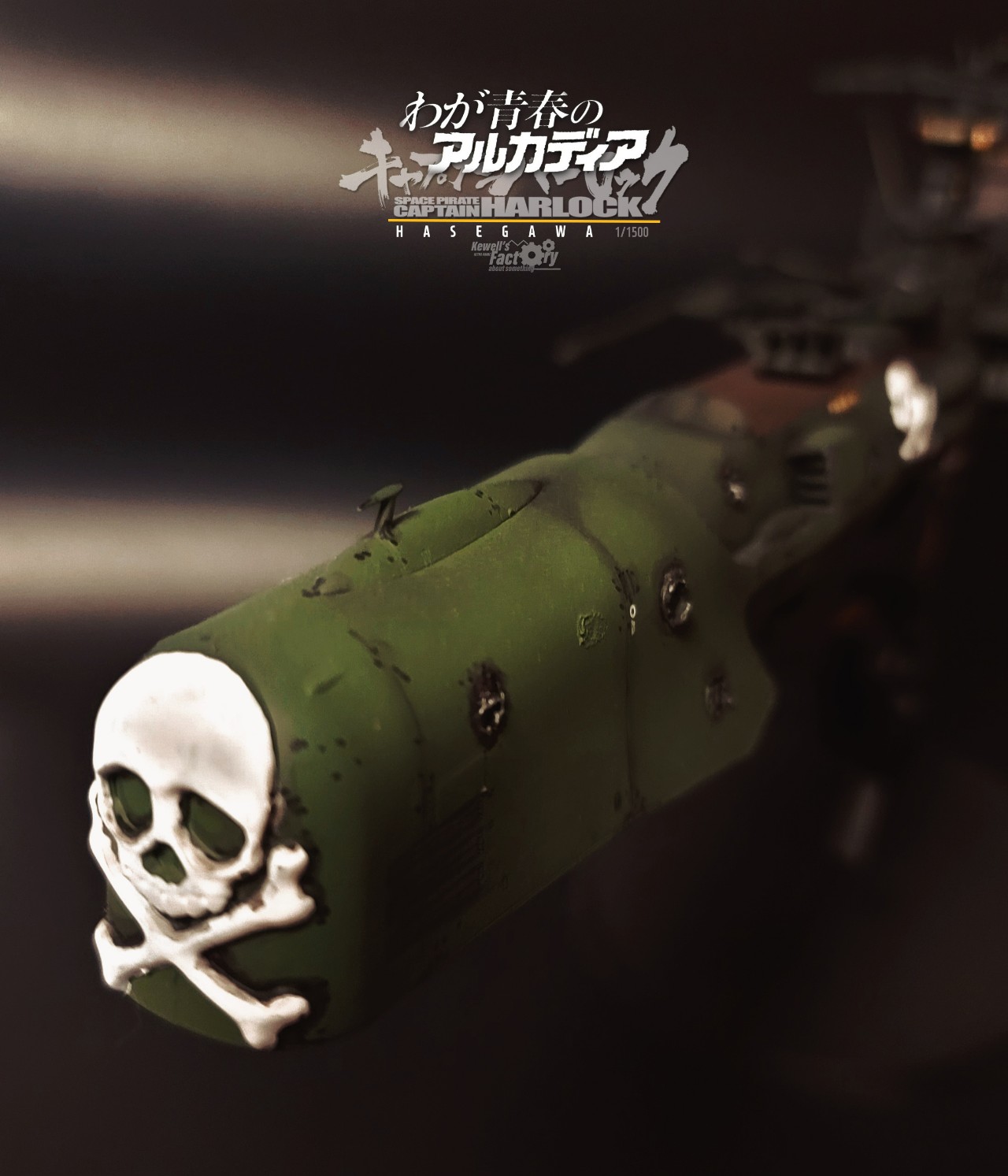 아르카디아호는 TV판이었던 세컨쉽보다 퍼스트쉽이 레이지버스에서 주로 많이 등장해서 이 전함이 더 존재감이 있기도 하고, 또 은하철도999 세계관과도 연결이 된 전함이어서 이 전함으로 작업을 진작부터 해보리라고 생각했었습니다. 다만 그냥 도색을 하기보다는 전장에서 많은 전투를 겪은 모습의 하드한 스타일로 시도했고, 그에 따라 웨더링을 비롯해서 곳곳에 함포 데미지를 적용해서 터프하게 묘사했습니다. 바디 톤은 선두와 바디에 채도톤을 달리해서 앞쪽 선두가 좀 밝은 계통의 다크그린이고 선미쪽으로 갈수록 짙어지도록 했구요. (이게 설정집을 보니까 미묘하게 톤이 이원화 되어있더라구요)