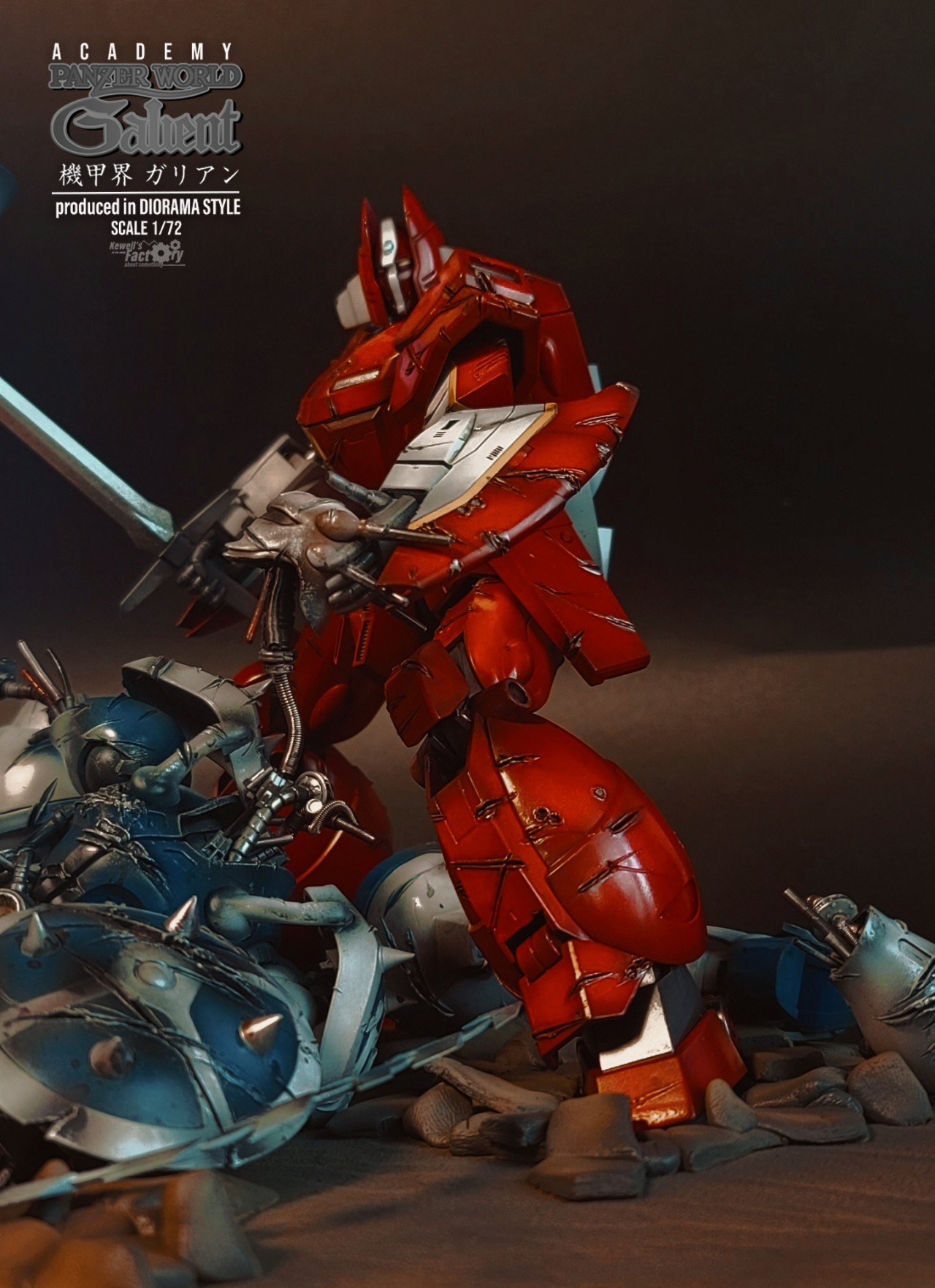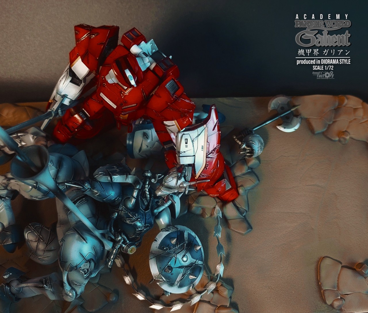 컨셉은 검격 컨셉이고, 데미지드 가리안과 프로마시스가 구성요소인데요. 가리안의 경우, 기본 명암도색 베이스에서 데미지 효과를 곳곳에 입혀놓았고, 프로마시는 부서진채로 바닥에 쓰러진 형태로 베이스에 고정으로 부착했습니다.