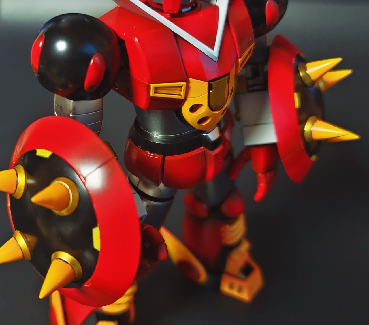 그렇다고 전면 메탈도색으로 반영한 것은 아니고, 헤드프레임과 뿔, 그리고 팔 상박, 허리, 허벅지까지만 실버메탈로 적용했습니다. 이런경우, 옐로우 파츠들 또한 골드로 도색하고픈 유혹도 있는데, 그렇게하면 너무 과할 듯 싶어서 일부분만 특징적으로 골드를 부분부분 입혔습니다.