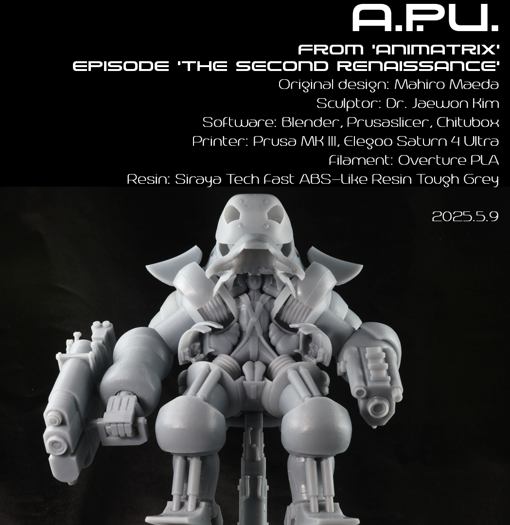 안녕하세요 이번에 네번째로 블렌더로 디자인후 3D 출력한 조형물 올립니다. 2003년도에 개봉한 Animatrix 에서 한 에피소드 중 하나인 The Second Renaissance 에서 기계군과 처절하게 전투하는 A.P.U. 입니다. 애니에서는 주로 당하는 역할로 나오는데, 그래도 팬더곰을 닮은 디자인에 등뒤에 동글동글한 부스터, 오리발 등 귀엽게 생긴 전투병기 입니다.