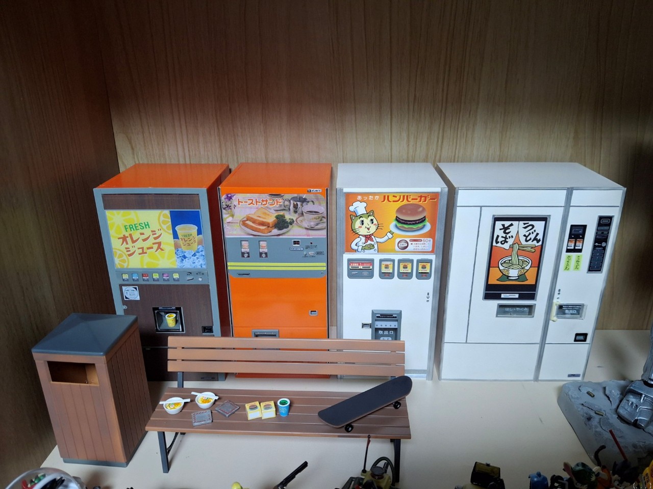 주스 자판기, 우동·소바 자판기, 햄버거 자판기, 토스트자판기, 벤치와 휴지통 을 만들어 봤네요.