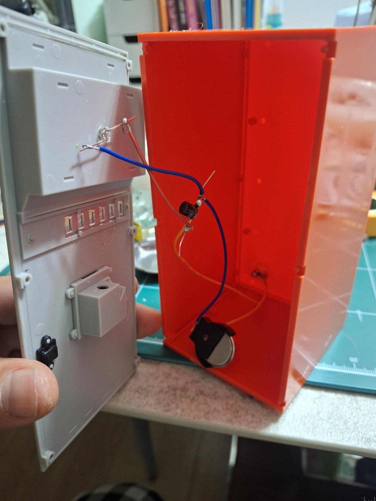 코인 전지를 사용해서 LED 두 알을 연결하고, 자판기 뒷부분에 조그만 구멍을 내고 스위치를 달아줬습니다.
