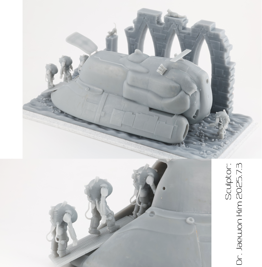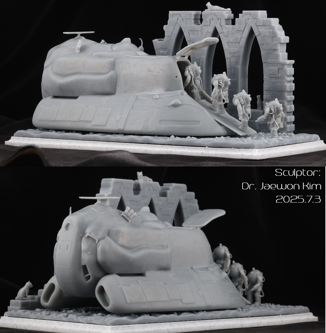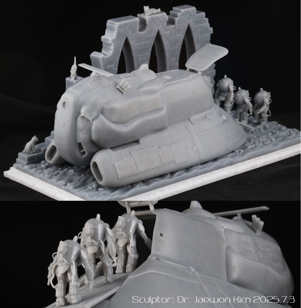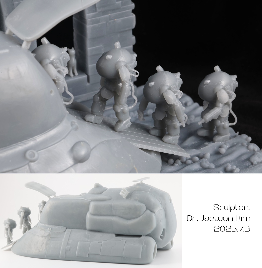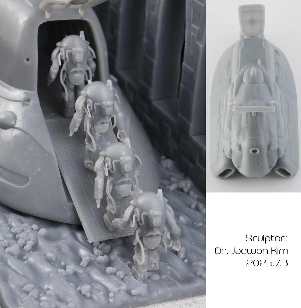 SAFS 는 이전에 팔케 2 만들때 썼던 STL 파일을 포즈를 손봐서 네분을 만들어주었습니다. 크기가 약 2.5CM으로 엄청 작다보니 서포트를 떼어내는게 일이였는데, 울트라소닉 나이프를 쓰니 정말 뚝뚝 잘떨어지더군요. 물론 조심하지 않으면 모형표면에도 손상이 갑니다만 편하게 작업했습니다. 디오라마 베이스의 발자국은 Boolean difference 로 여러개 만들어 주었습니다.