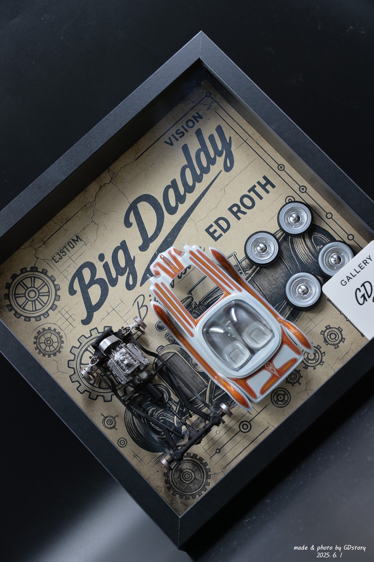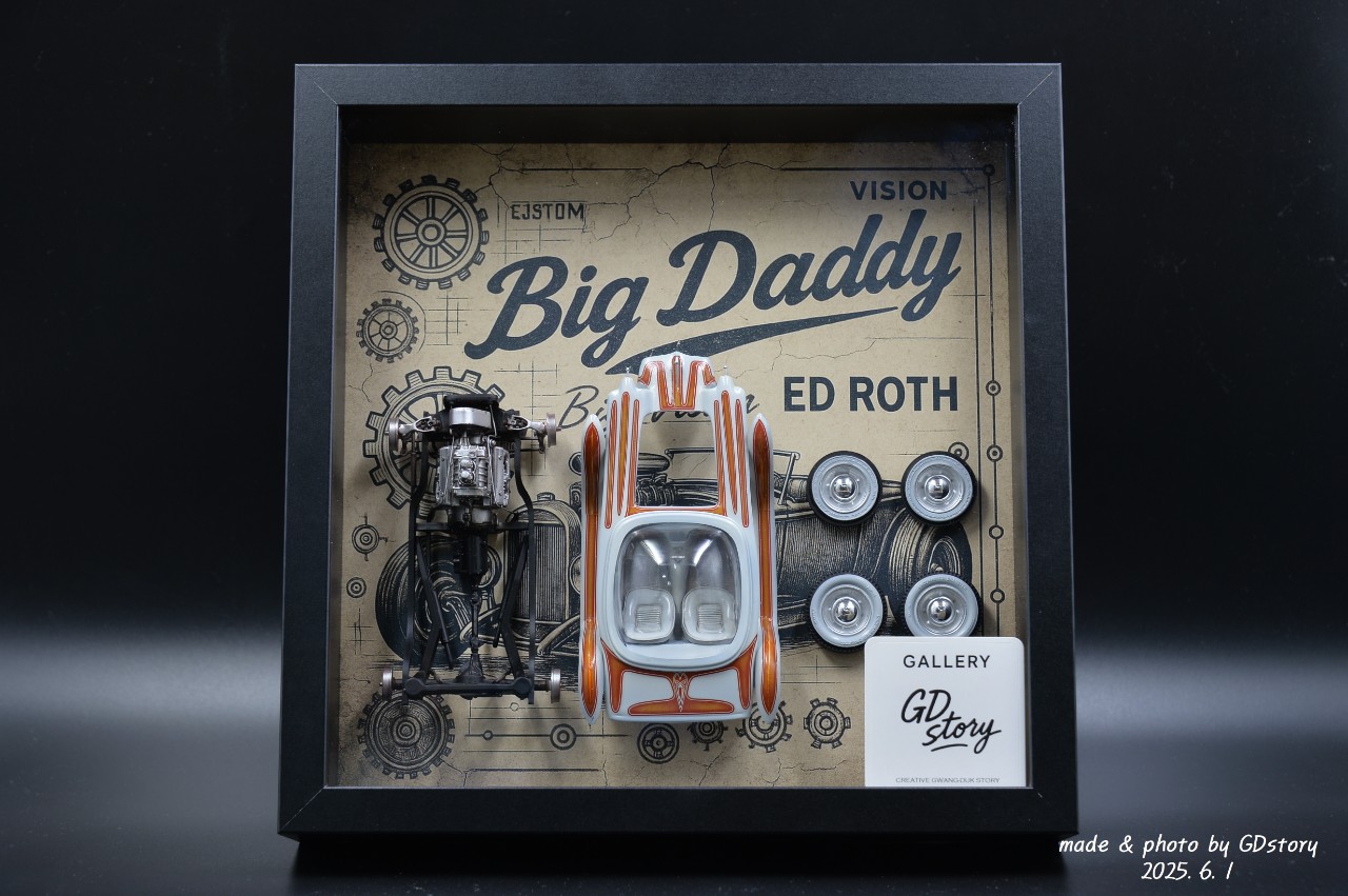 기존의 일반적인 조립 방식 대신, 바디, 섀시, 엔진, 휠을 각각 분리하여 액자형 전시 구성으로 완성했습니다. 하나의 미니어처 아트워크처럼 보이도록 연출한 게 이번 작업의 포인트입니다.