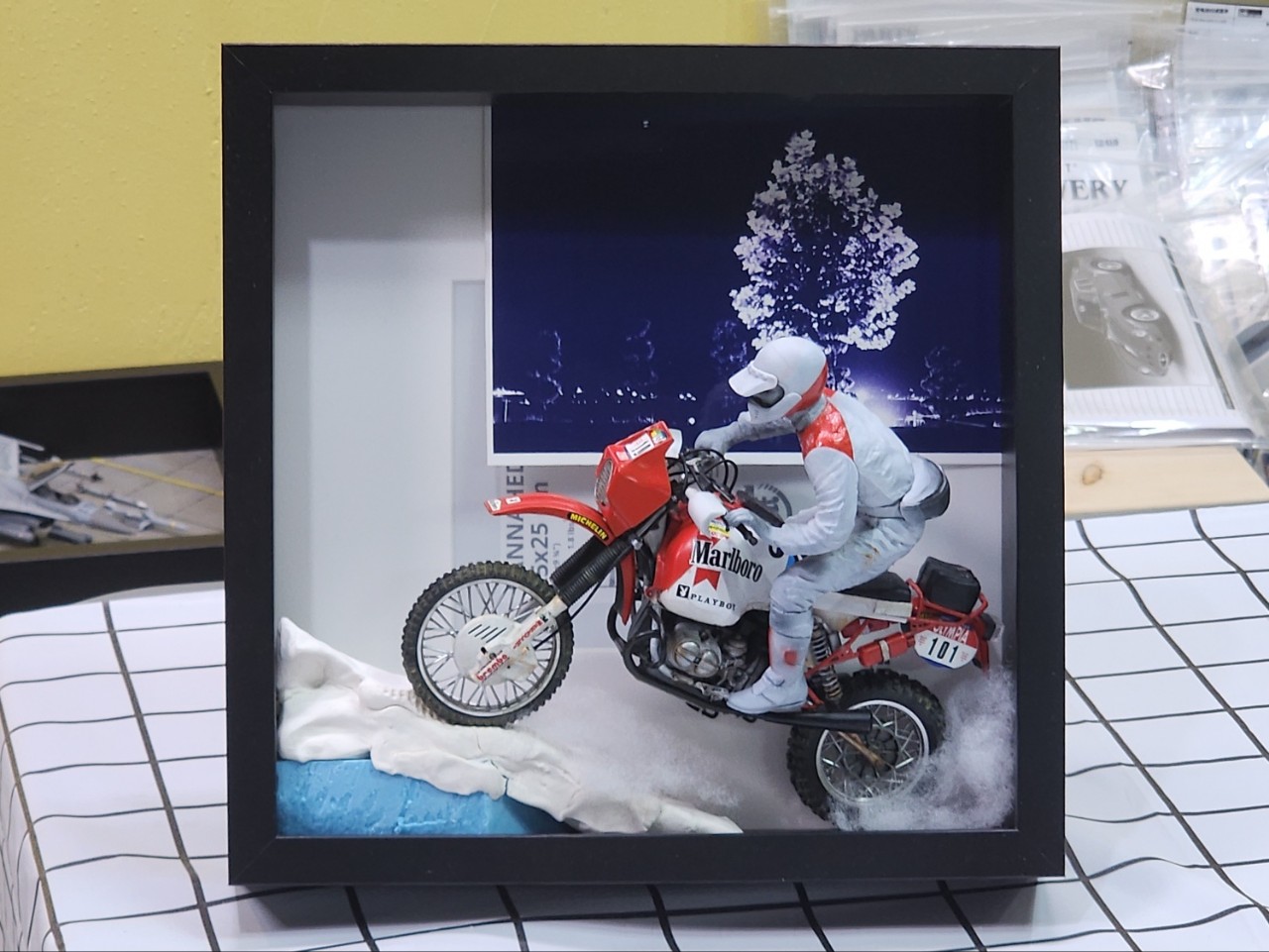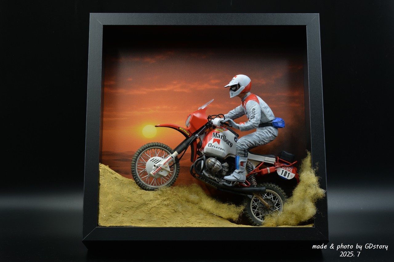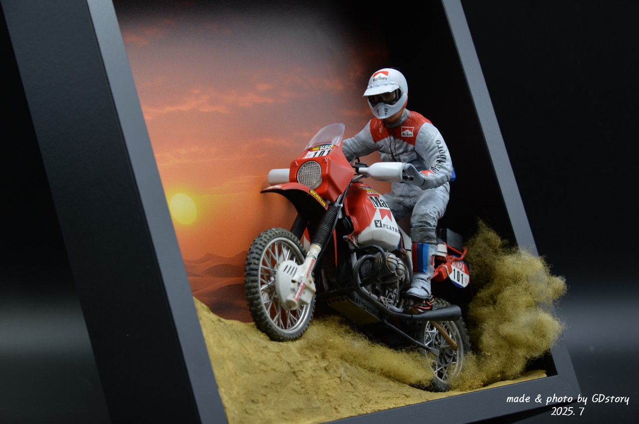 이 BMW R80 G/S는 오늘날 GS 어드벤처 바이크 계보의 원조로 불리며, 이 대회를 통해 그 역사를 남겼습니다. 이번 작업은 액자형 디오라마로 그 순간을 담아보았습니다.