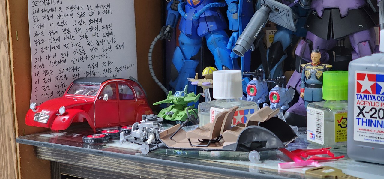 어렵사리 구했던 군제의 루팡 3세 칼리오스트로의 성 시리즈 중 하나인 클라리스가 들어있는 시트로엥 2CV를 만들었습니다. 평가에서도 상당히 조립과 완성이 까다로운데 디테일은 다이캐스트보다 못하다고 하니 클라리스와 애니속 묘사된 본넷을 재현하기 위한 레진 부품들, 데칼은 타미야 1/24 시트로엥 2CV에 적용하는게 좋다는 생각이 들어 제작하게 되었습니다... 만 전혀 만만하게 볼 키트가 아니여서 고생을 심하게 했습니다. 작례 사진을 보면서 고생길을 보았어야 했는데 바퀴 축이 뒤틀려 있는지 저렇게 한쪽 바퀴가 안닿는것은 예삿일이고 본넷은 한쪽만 맞고 한쪽이 안맞으며(...) 가장 큰건 전면 유리창이 제대로 끼워지질 않아서 순접 범벅이 되어버려 그냥 1천방 사포로 밀어버리고 6천방, 8천방으로 갈아내고 별짓을 다 했습니다.