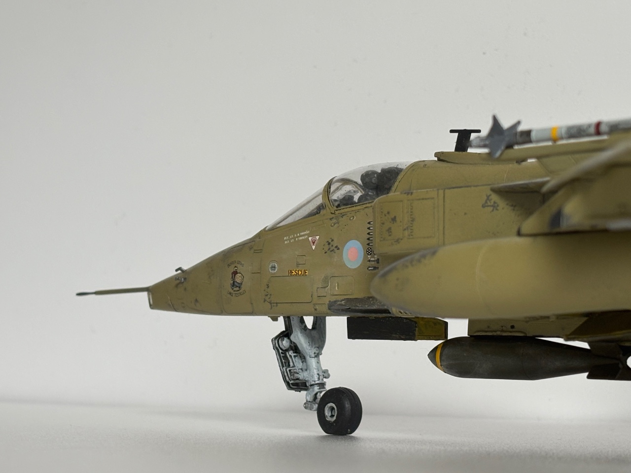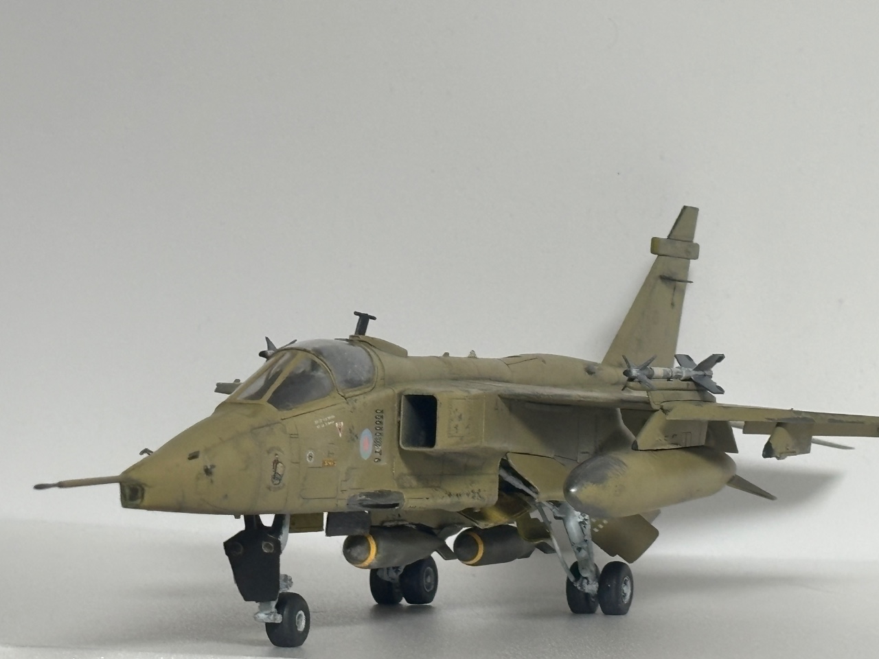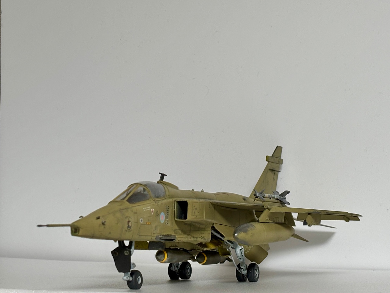 C버전이며 무유도 폭탄과 드롭탱크, Aim-9L 사이드와인더를 두개씩 달아줬습니다. 전체적인 조립성은 매우 훌륭하지만 에어브레이크 유압바 접착시 위치가 애매해서 접착하는데 애를 좀 먹었습니다. 재규어의 덩치는 F-16보다 살짝 크고 공대공 미사일이 날개위로 달리는 특이한 친구입니다..