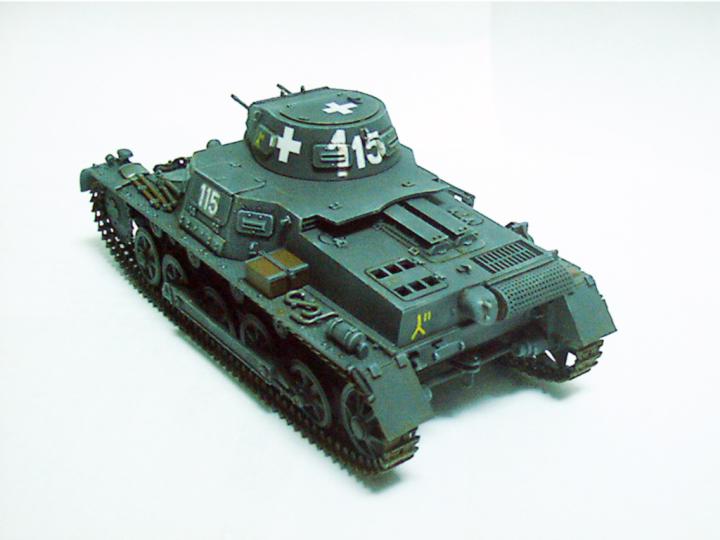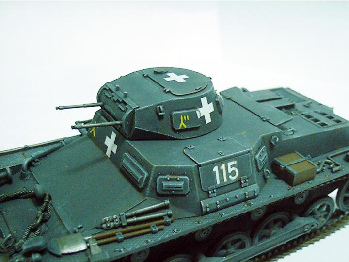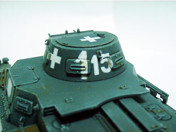 데칼이 들어 있기는 하지만 맘에 드는 것이 없어서 자료 사진을 참조해서 백색 십자를 스텐실로 그려주었다.115마크는 타미야 2호 전차의 것을 노란색의 사단마크는 시각적 효과를 위해 일부러 노란색으로 그려주었다(물론 원래도 노라색이지만)소속은 폴란드전당시 3사단.
