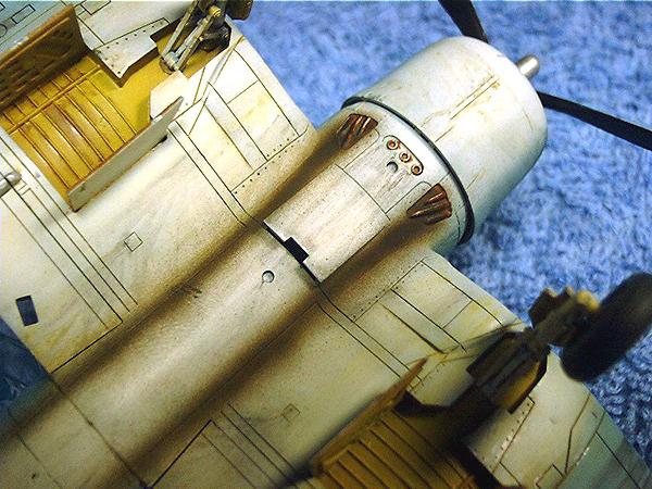 웨더링은 유화와 파스텔을 사용하였습니다. 유화는 5가지 정도의 색을 조금씩 짜놓고 사용하였는데 기체가 작기 때문에 많이 필요하지는 않았습니다. 세필로 기름 등이 흘러내린 자국을 아주 가늘게 그린 뒤 신너만 묻힌 붓으로 살살 쓸어주는 방법을 이용하였습니다. 기관총구의 그을음은 유화로 자국을 먼저 그린 뒤 검은색 파스텔 가루를 붓에 묻혀 쓸어주었습니다.