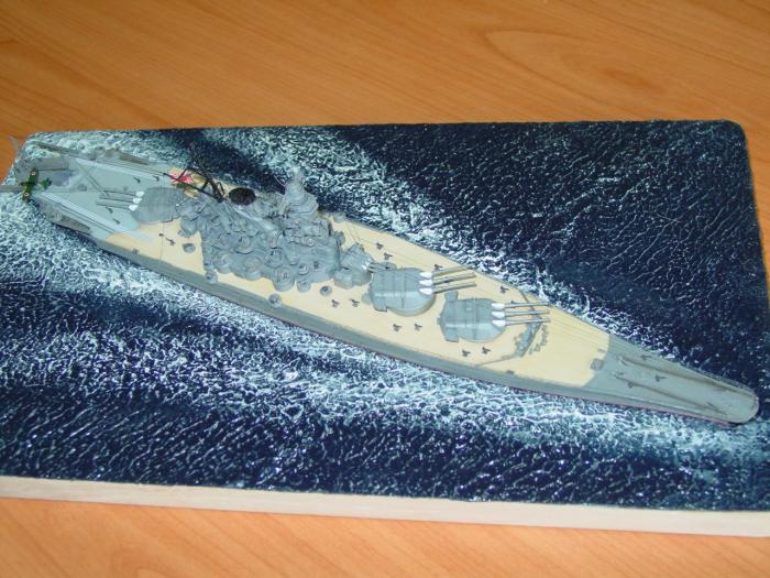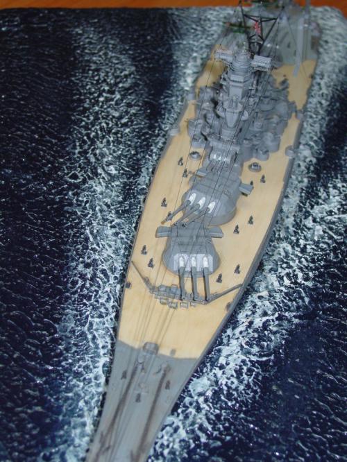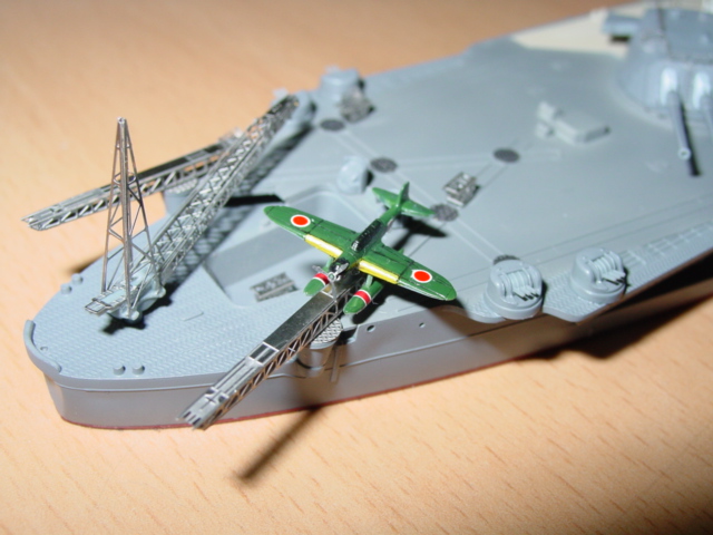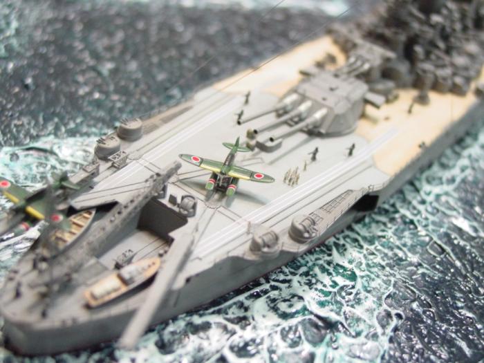 선미의 비행갑판부분입니다. 크레인과 케터펄트 수상기 운반장치를 피트로드제 에칭으로 만들어 봤습니다. 바다는 요즘 유행하는 겔미듐으로 형태를 잡았고, 흰 포말은 역시 에나멜 무광백색을 이용해서 드라이 브러싱 했습니다. 역시 마무리로 아크릴 유광 바니쉬를 사용했습니다.