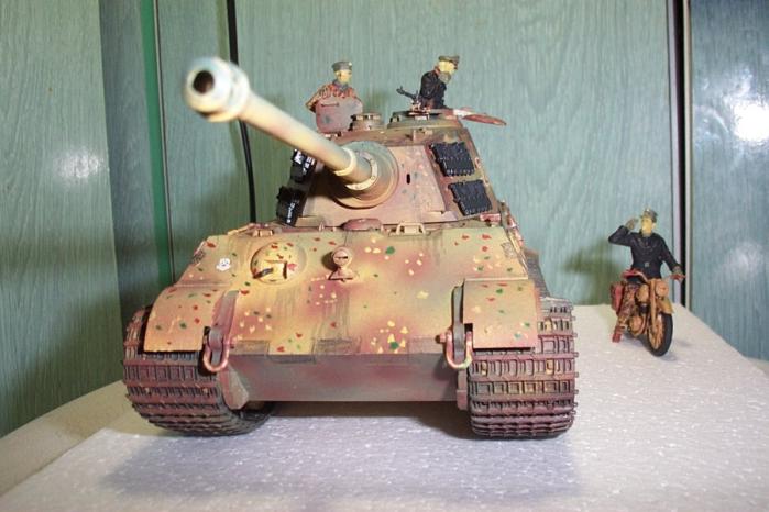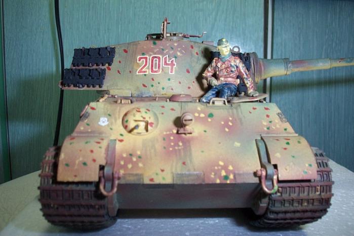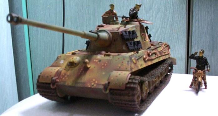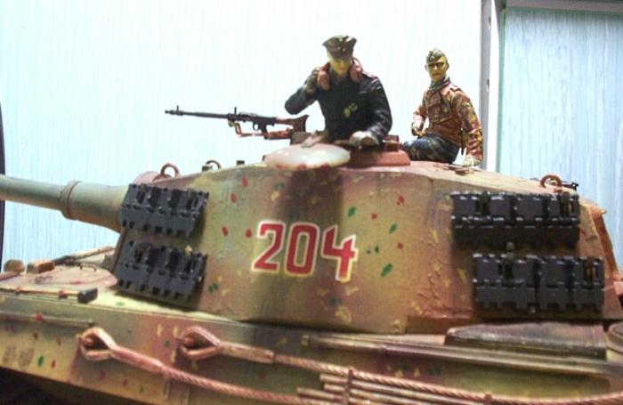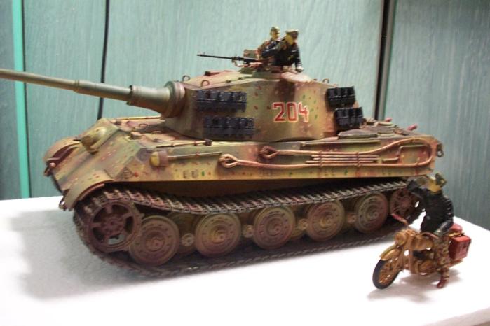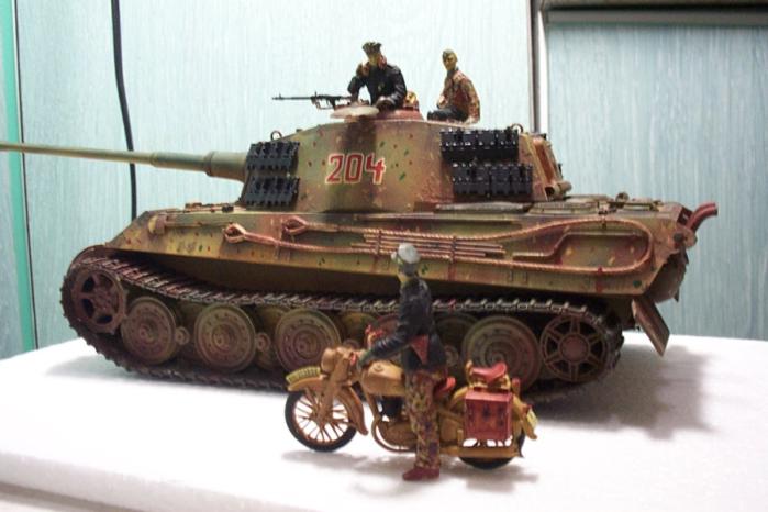 티거2(킹타이거 또는 쾨니히스티거로도 불림) 거의 독일 최강전차급입니다. 그러나 만성적인 연료부족으로 피격당한 전차보다 버리고간 전차가 많았다고 합니다. 전조등와이어설치, 메쉬로 엔진부분을 덮었습니다. 철심을 박아 캐터필러 처침 표현하였습니다. 신경써서 인형도 칠했는데 아직은 부족한 듯...
