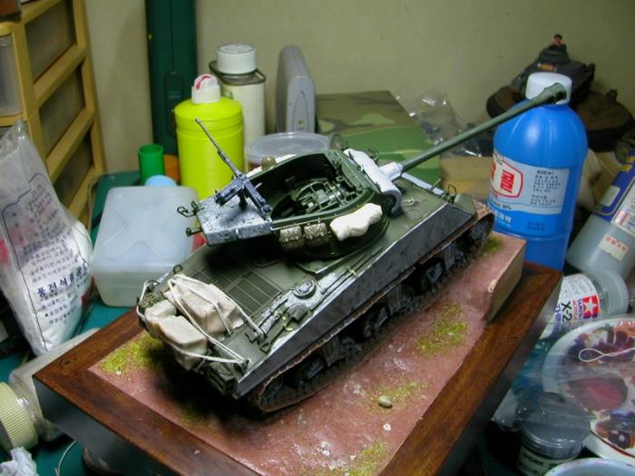 전에 셔먼차체에 잭슨포탑이 붙은걸보구 만들어보구싶었는데 아카데미에서 고맙게도 만들어주어서 이렇게 만들게돼었습니다.하체하고 포탑은 아카데미껄쓰고 상체는 타미야 m4a3를 썼습니다.