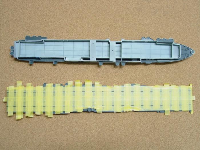 함체내의 격납고를 플라판으로 자작을 해 준 모습입니다. 정확한 형상을 알 수 없어서 격자 무늬로 홈을 파서 바닦형상을 재현 해 봤고, 비행갑판의 비행안내선을 스텐실로 하기 위해 마스킹 해 둔 사진입니다.