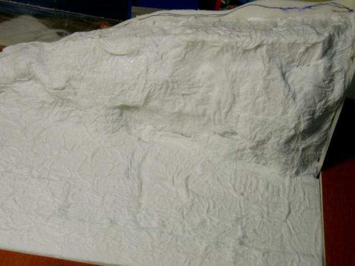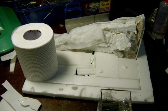 베이스는 굴러다니는 우드락 조각과 공사장서 주운 단열재 조각으로 만들었습니다. 대충 형태를 잡은후 화장지로 겉을 감싸며 목공본드를 물에 풀어 발라줍니다.