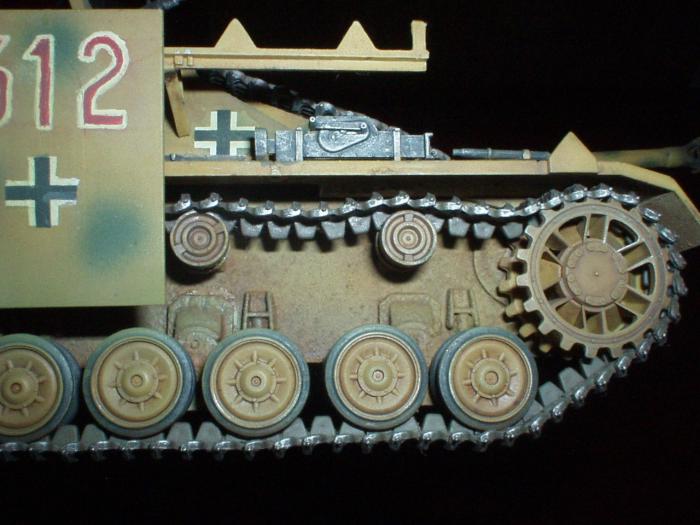 좌측면 입니다.장갑판에 있는 차량넘버는 손으로 그려주었습니다.손이 자꾸 떨려서리 혼났습니다........차체하부는 고운모래와퍼티를 락카신너에 섞은후 붓으로 발라서 흙표현을 했는데 어떠신지......???