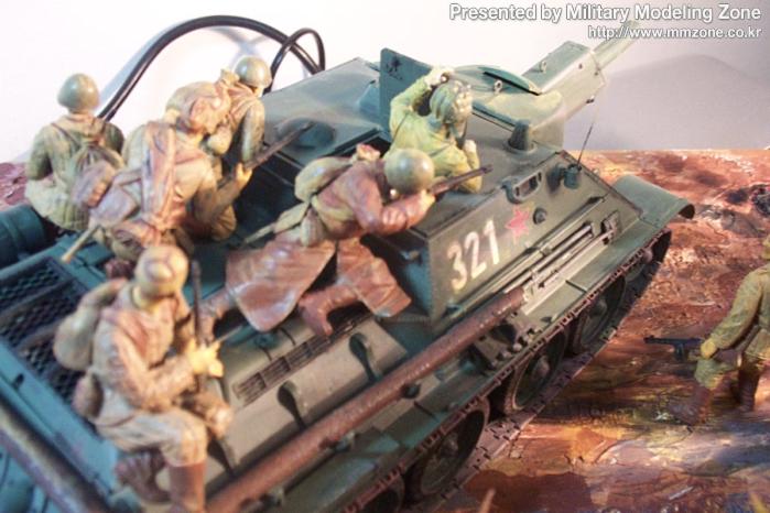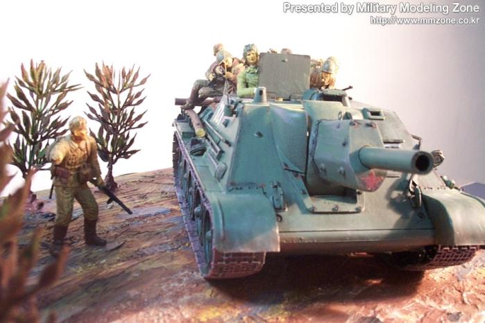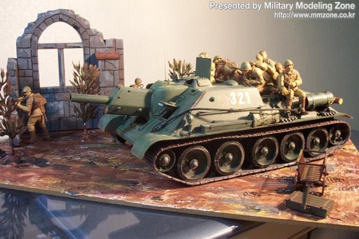 타미야 su-122입니다. 소련진격병과 매치했습니다. 예전에 쓰던 베이스에 나무심고 이타레리 교회 잔해를 올렸습니다. 탱크는 안테나 엔진 망, 조종수,조명등 정도를 처리했습니다. 스쿼드런 자료집에 보면 정말 소련병사가 개떼(?)처럼 올라타 있더군요! 역시 전체가 아크릴 붓질...아! 요즘은 에어브러쉬 쓰는 법도 까 먹겠습니다. 포가 돼지코방패를 연상시킵니다.
