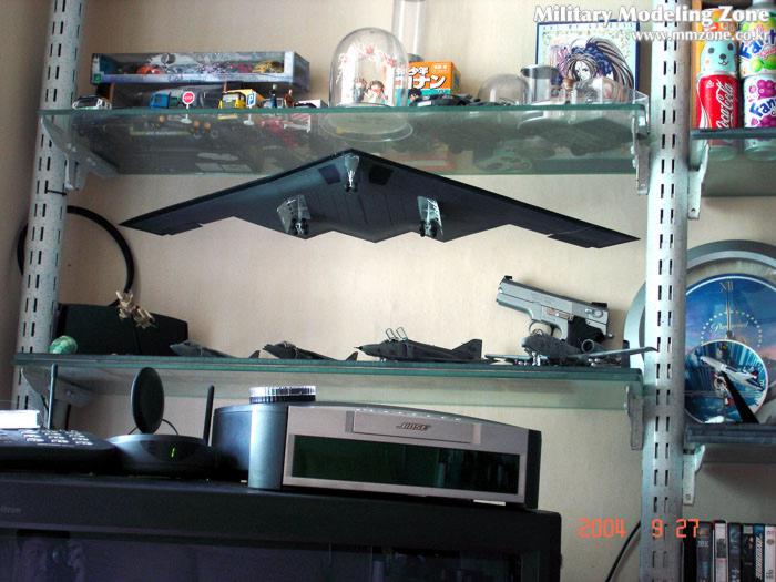 B-2를 어디다 둘까 고민하다가 결국 대롱대롱 매달아 놓기로 결정했습니다. 아주 가느다란 낚시줄을 이용해 장식장의 윗부분에 매달아 놨습니다.