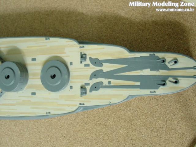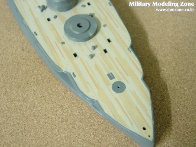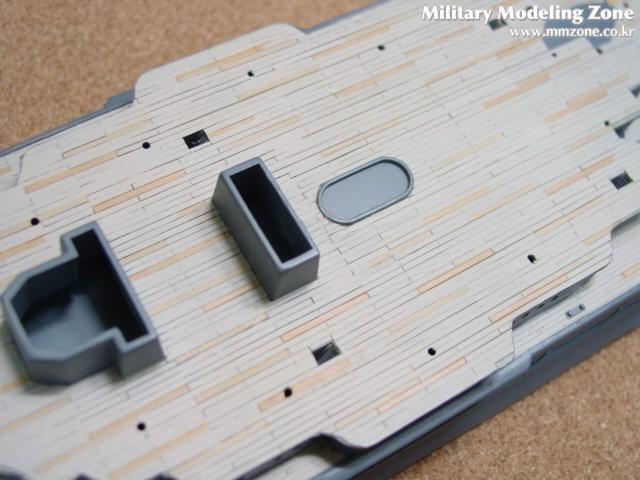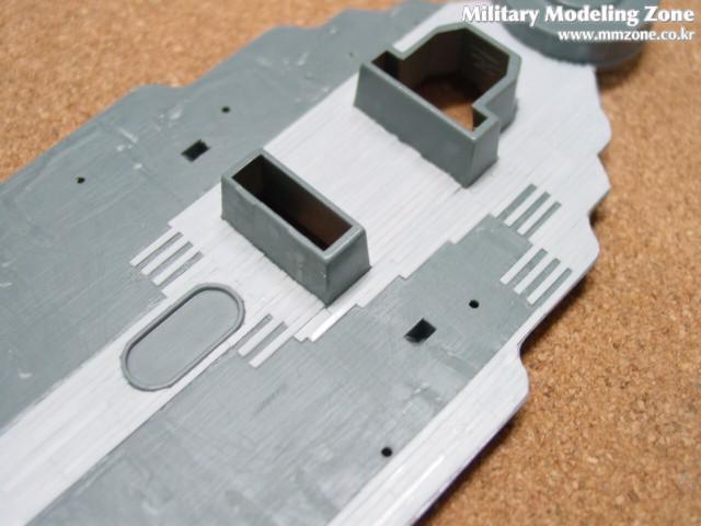 상갑판을 작업중에 찍은 사진입니다. 이 곳에 5인치 단장 대공포 8개가 올라가는데 쉴드를 에칭으로 교체하기위해 몰드된 것을 밀어 냈더니 목갑판 몰드가 엉망이 되더군요. 할 수없이 0.3밀리 플라판으로 갑판을 플랭킹 했습니다.