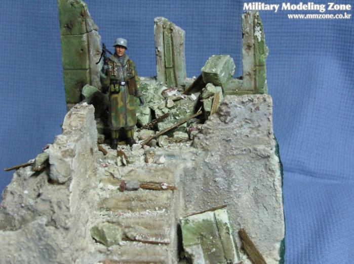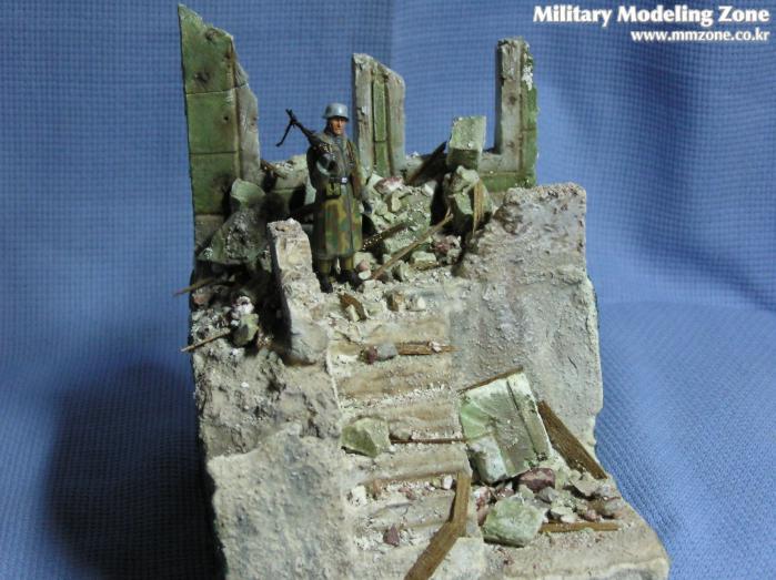 베이스는 스티로폼을 기본으로 계단을 잘라서 붙이고 석고를 한겹 입힌 다음 뒤 배경이 되는 건물은 우드락에 대충 건물모양을 정하고 테두리와 창문부분을 우드락을 잘라 붙이고 물게 갠 석고를 부어서 굳힌 뒤에 약간 덜 굳었을때 건물 모양을 새겨주고 파괴된 모습을