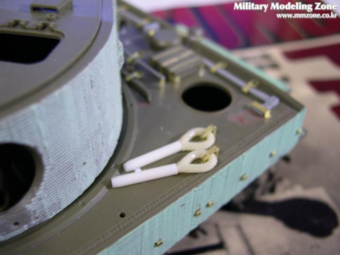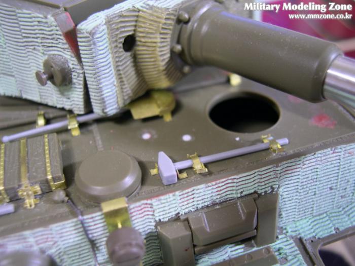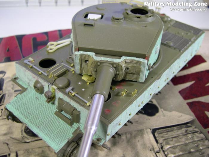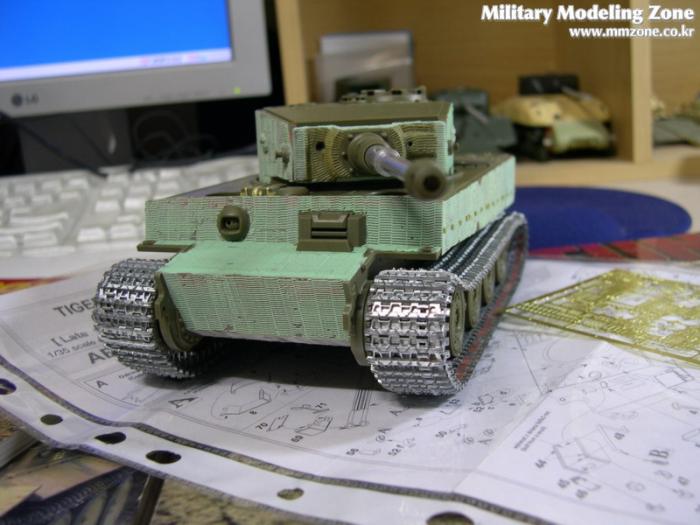 제작에 쓰인 제품은 AFV Club 타이거 I 후기형, Aber 타이거 에칭, KARAYA 타이거 궤도, KARAYA 토잉 케이블, 로얄모델의 바스켓등을 사용했습니다. AFV Club이 타이거 조립시 어려운점은 포탑조립에 있습니다. 포탑 조립만 빼놓고, 나머지 부분은 수월하게 작업할 수 있습니다. 그리고, 찌메리트는 처음에는 모델링 페이스틀 사용하다가 다루가기 힘들어서 타이야 폴리에스터 퍼티로 작업을 마무리 했습니다. 포방패 굴곡부분은 에폭시 퍼티로 만들어 주었습니다.