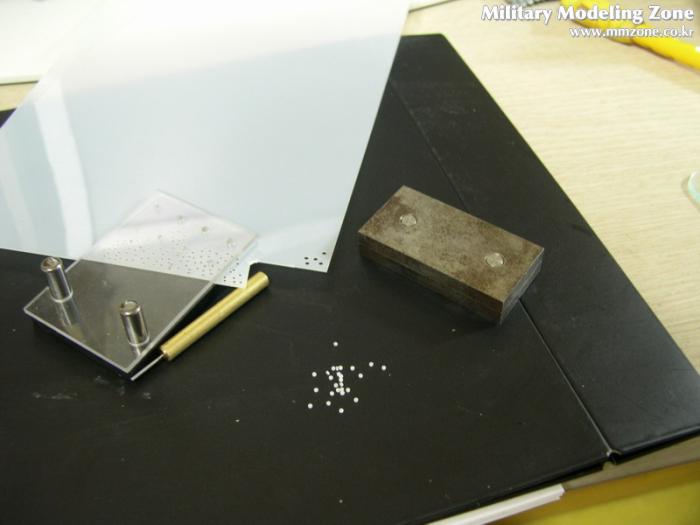 궤도의 볼트를 표현하기 위해서 펀칭 작업을 한 모습니다. 도구를 이용하니 작업 속도는 빨리 나옵니다.