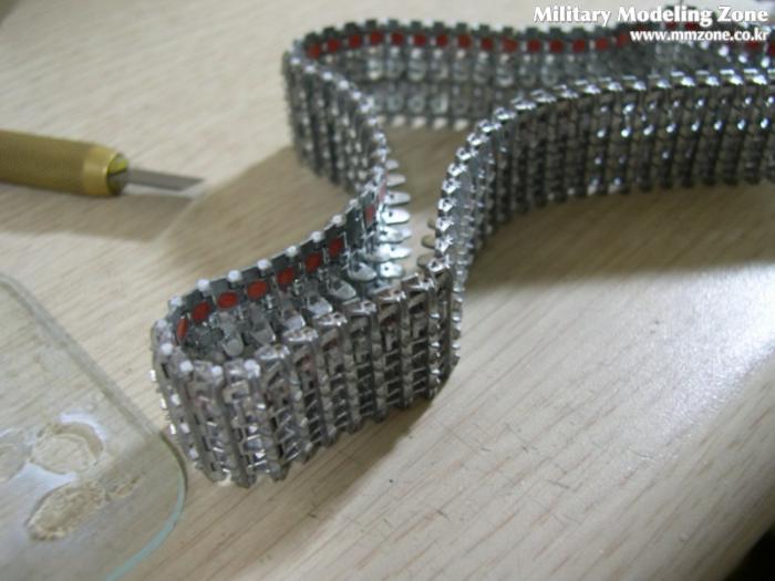 펀칭 작업후 궤도의 이식하는 중입니다. 이번에 구입한 궤도는 작업 시간을 상당히 많이 소모하게 만들었습니다. 상당히 많은 양의 줄질을 했습니다. 특히 가이드 핀의 두꺼워서 로드휠 및 아이러 휠이 들어가지 않습니다. 많은 시간을 가이드 핀을 얇게 처리 하는데 소모 했습니다. 그리고 밀핀 자국은 레드퍼티로 처리 해 주었습니다. 이런 부분이 이제품의 단점이기는하나, RC용으로 쓰기에는 적합한 것 같습니다.